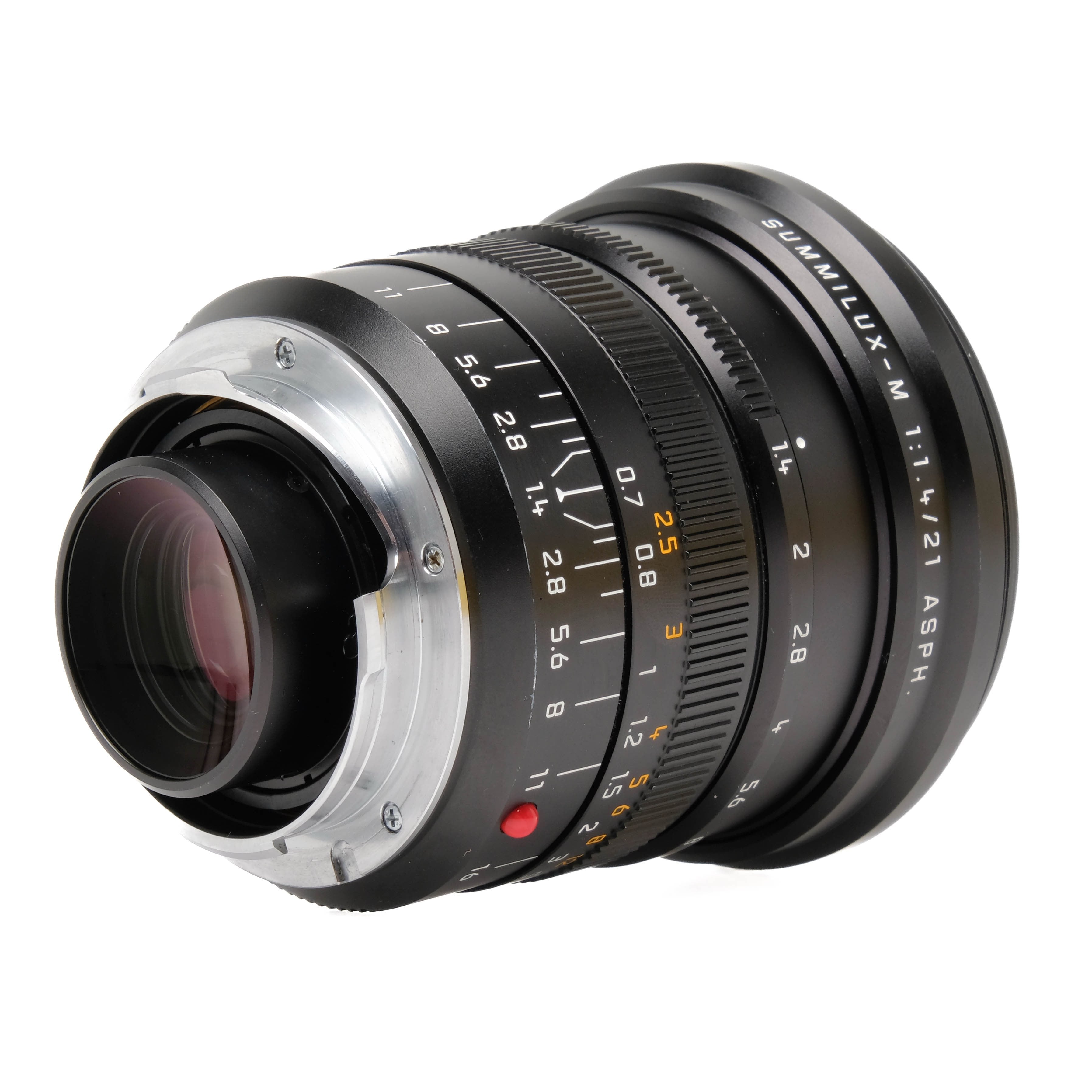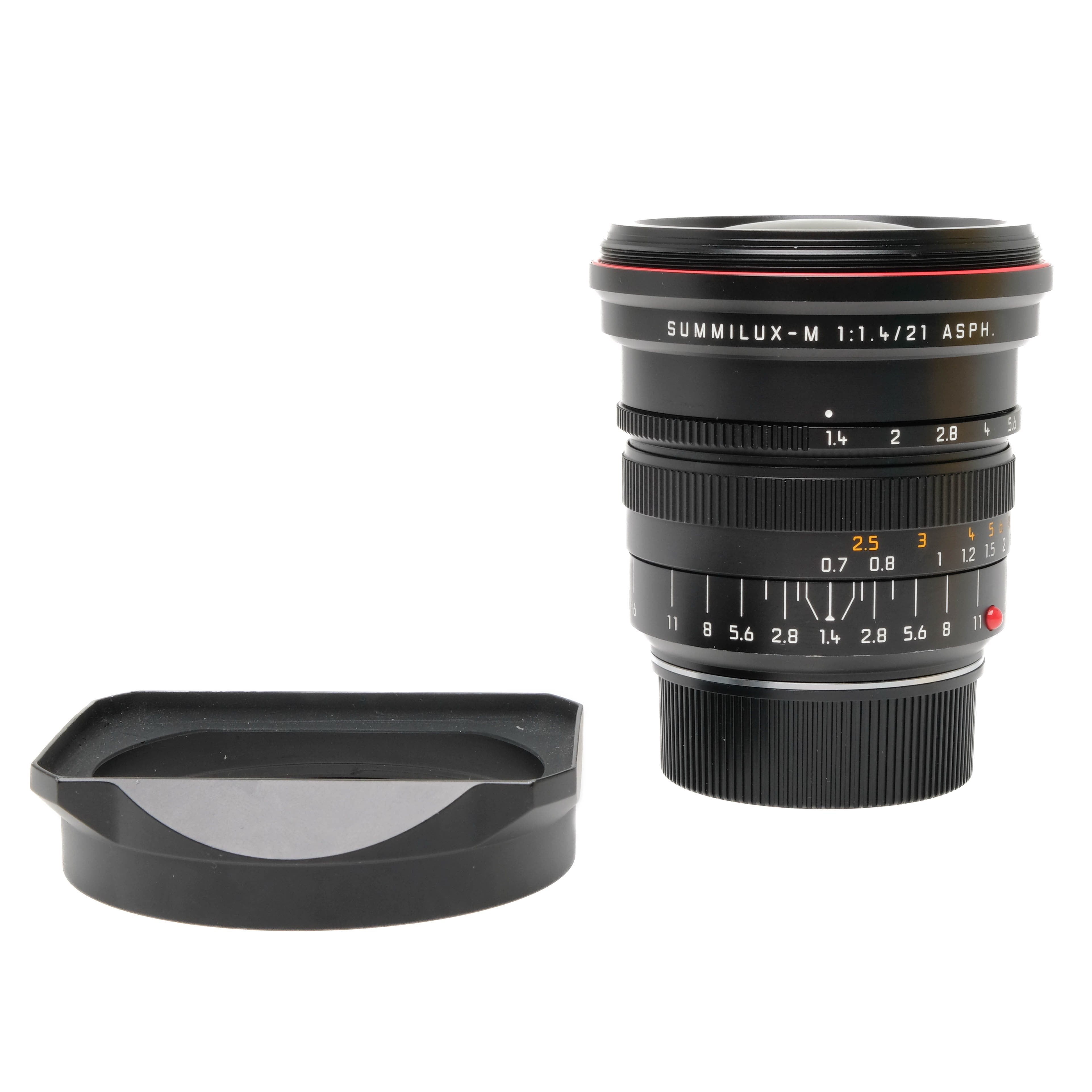 This Leica 21mm f1.4 Summilux-M #4172722 is in good condition with minor handling and edge wear. I rate it cosmetically (8+). The focus and aperture knobs and the aperture functions properly. The glass is clean and clear with no haze, marks, or fungus. This includes a rear cap and hood. Please refer to the photos for details.