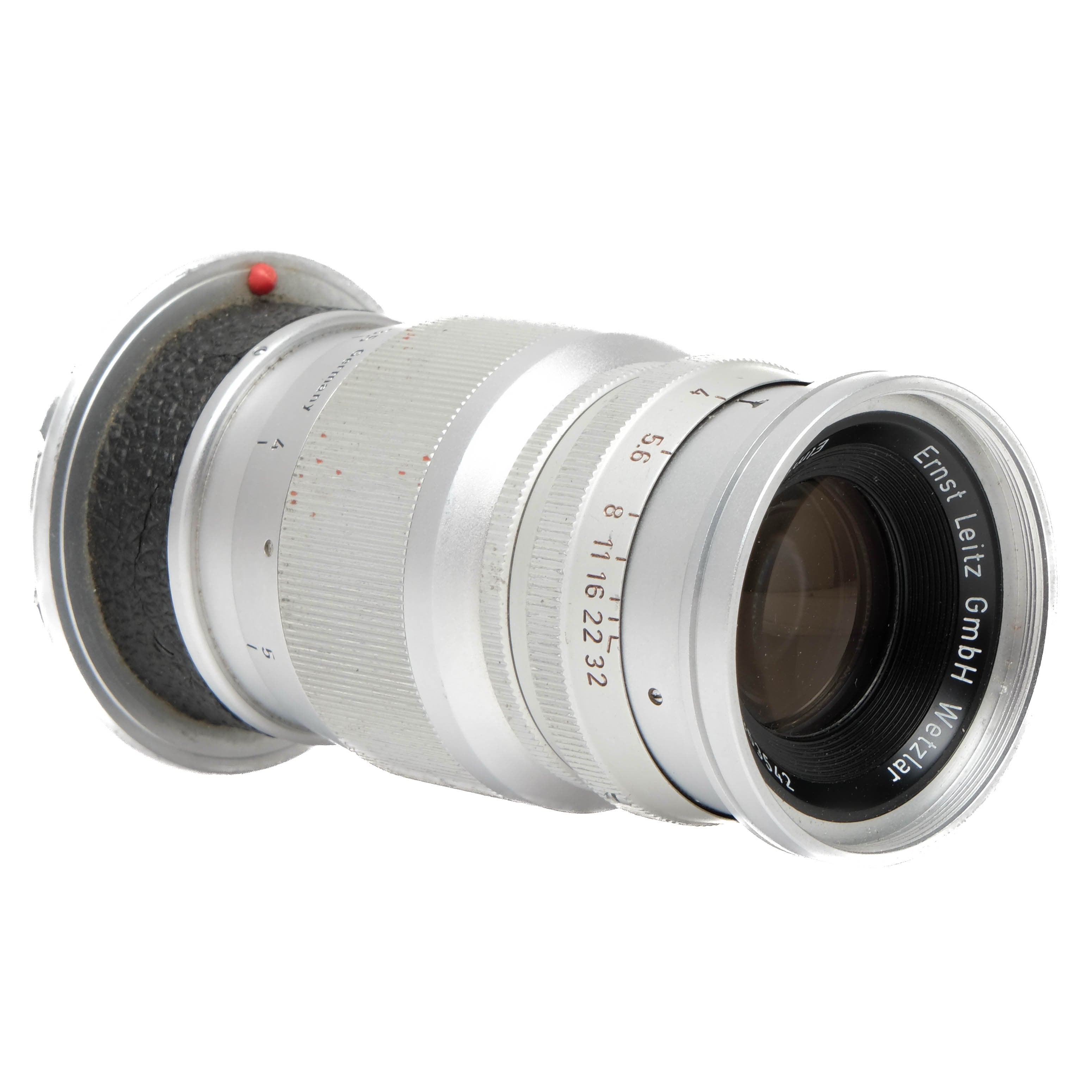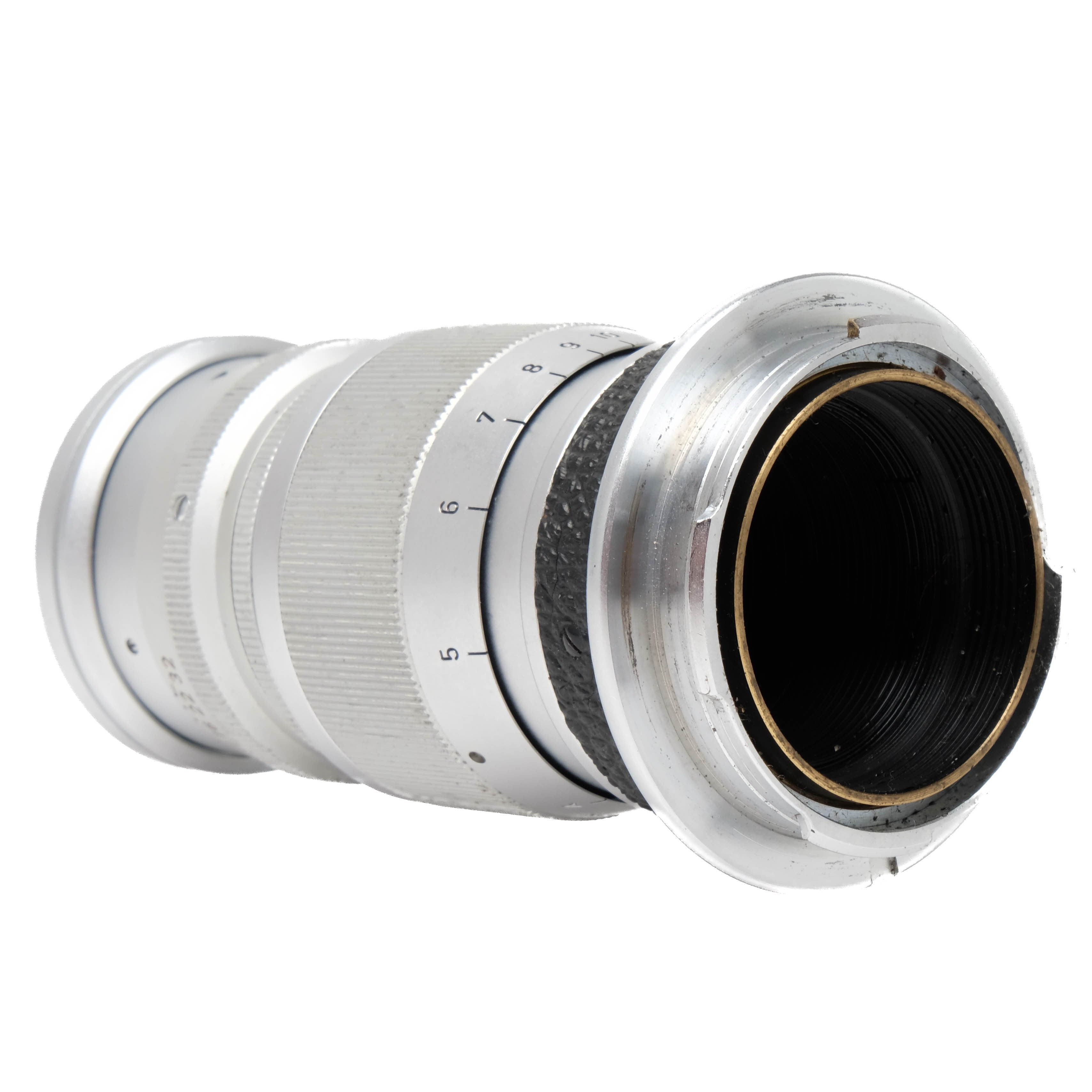 This Leica 9cm f4 Elmar is in good condition with normal handling and edge wear. I rate this cosmetically (8+). This lens is in proper working order, the focus is smooth and the glass has a slight haze but no marks or fungus. This lens comes with front/rear caps.