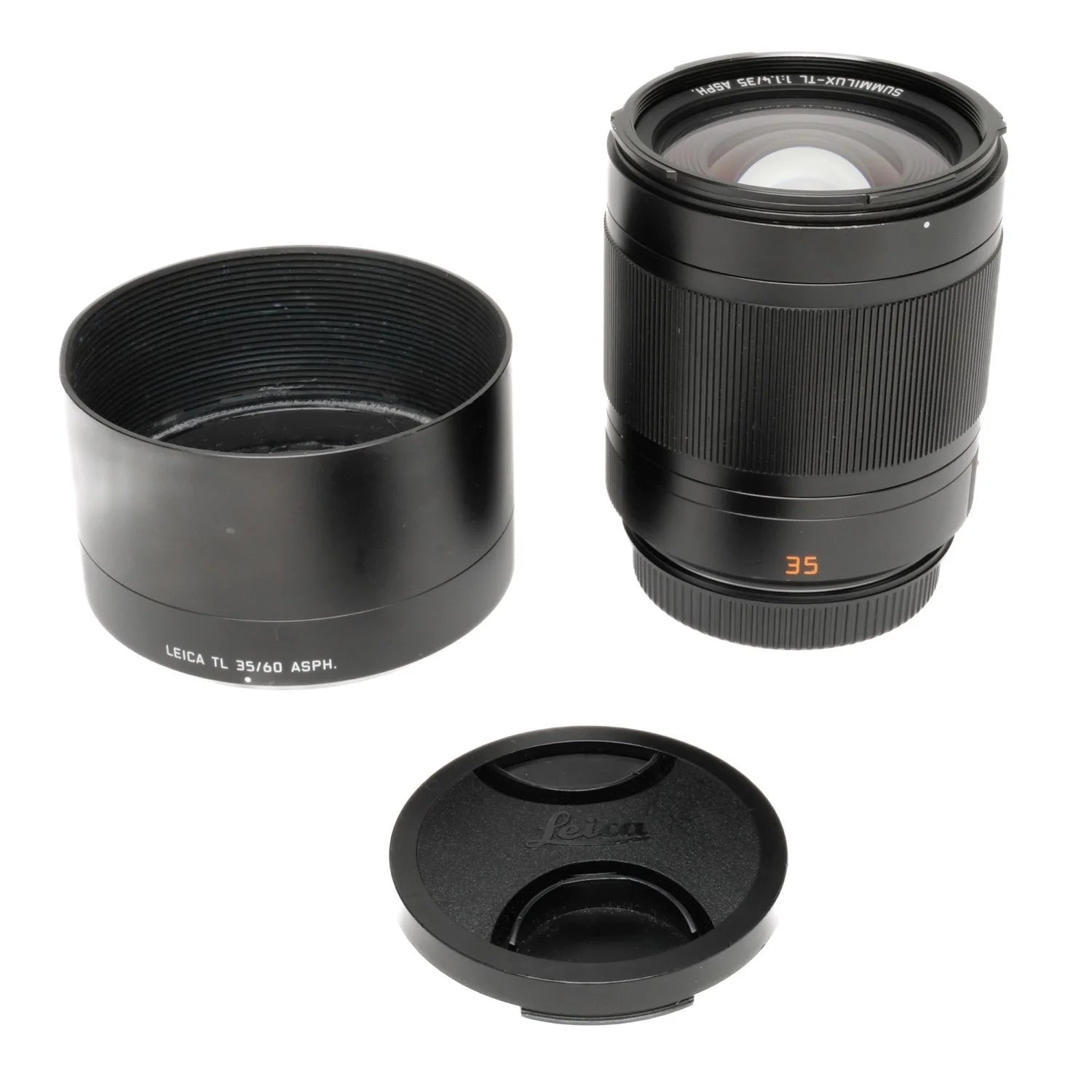 This Leica 35mm f/1.4 Summilux-TL lens is in good cosmetic condition with minor handling and edge wear found throughout; please see photos for visual reference. Cosmetically, this lens has been rated at a (8+) condition. This lens is in proper working order; the autofocus is accurate and the focus ring turns smoothly. The aperture functions properly, and the glass is clean and clear with no marks, fungus, or haze. This lens includes front and rear caps and hood.