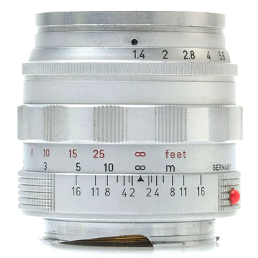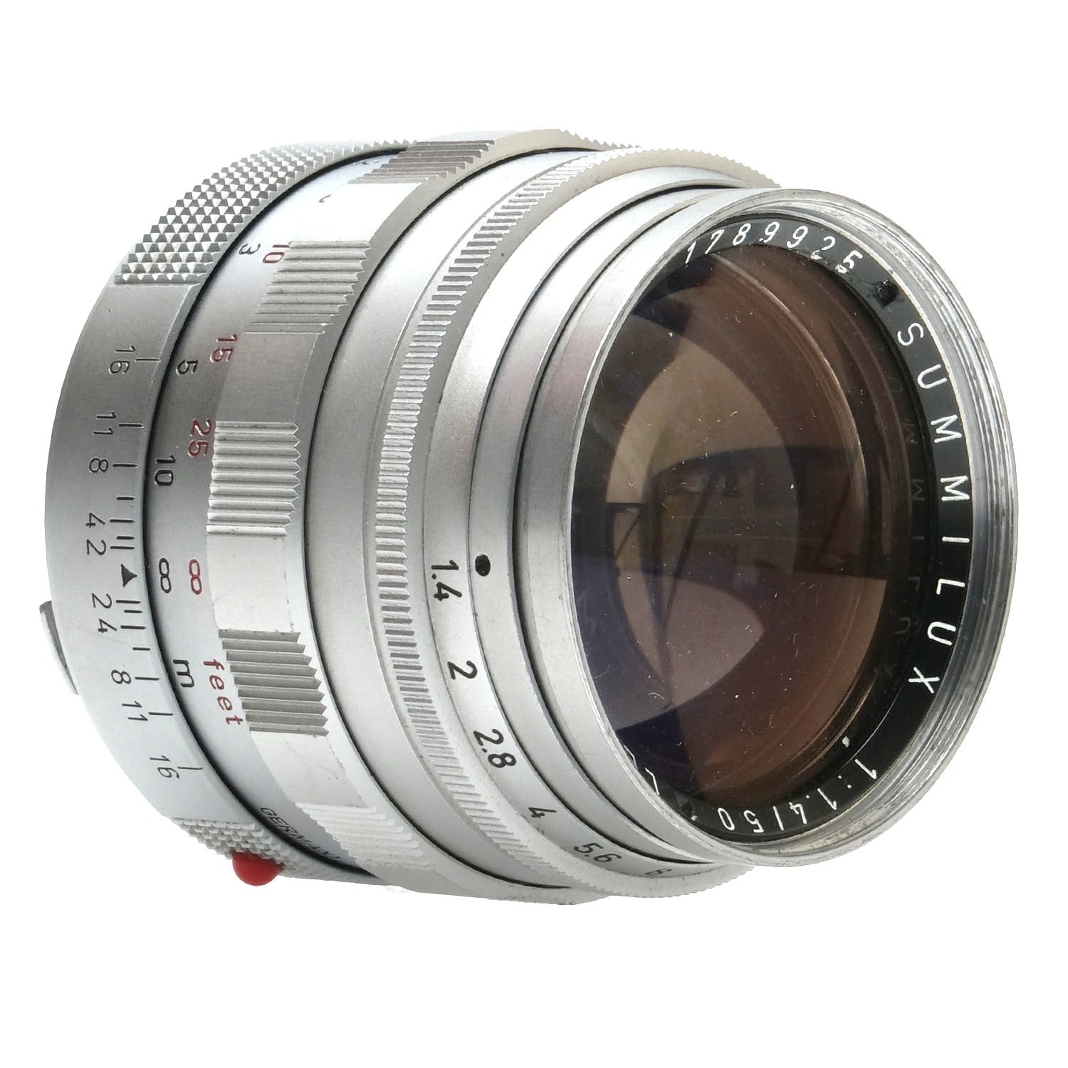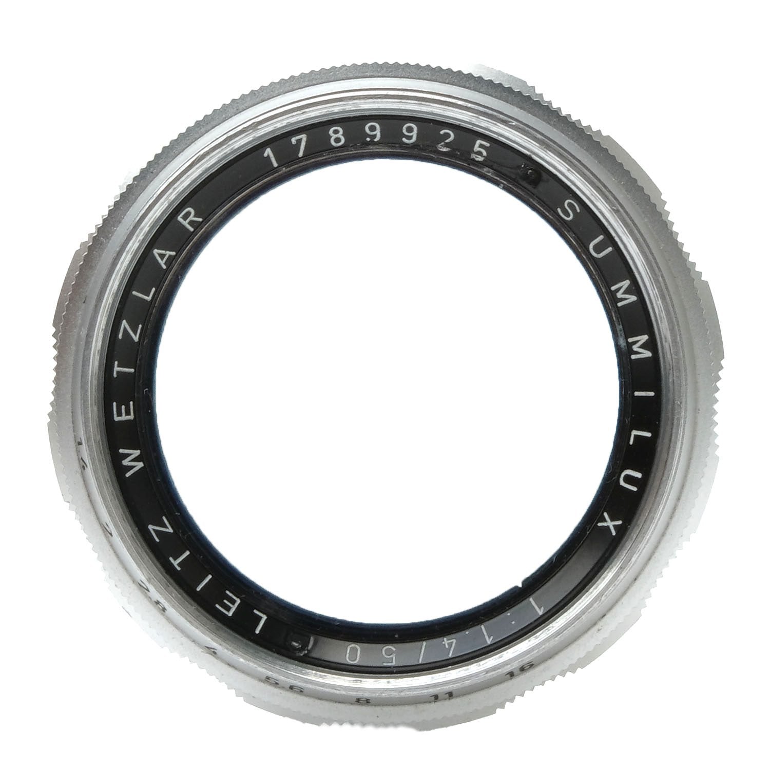 This Leica 50mm f1.4 Summilux M Lens (Silver, V1), #1789925, is in great condition with minor handling wear. I rate it cosmetically a (9). The focus and aperture rings are smooth, the aperture functions properly, and The glass is clean and clear with no haze, marks, or fungus. There are a few faint specks of dust inside, but they do not affect image quality. This lens includes front & rear caps. Please refer to the photos for details.
