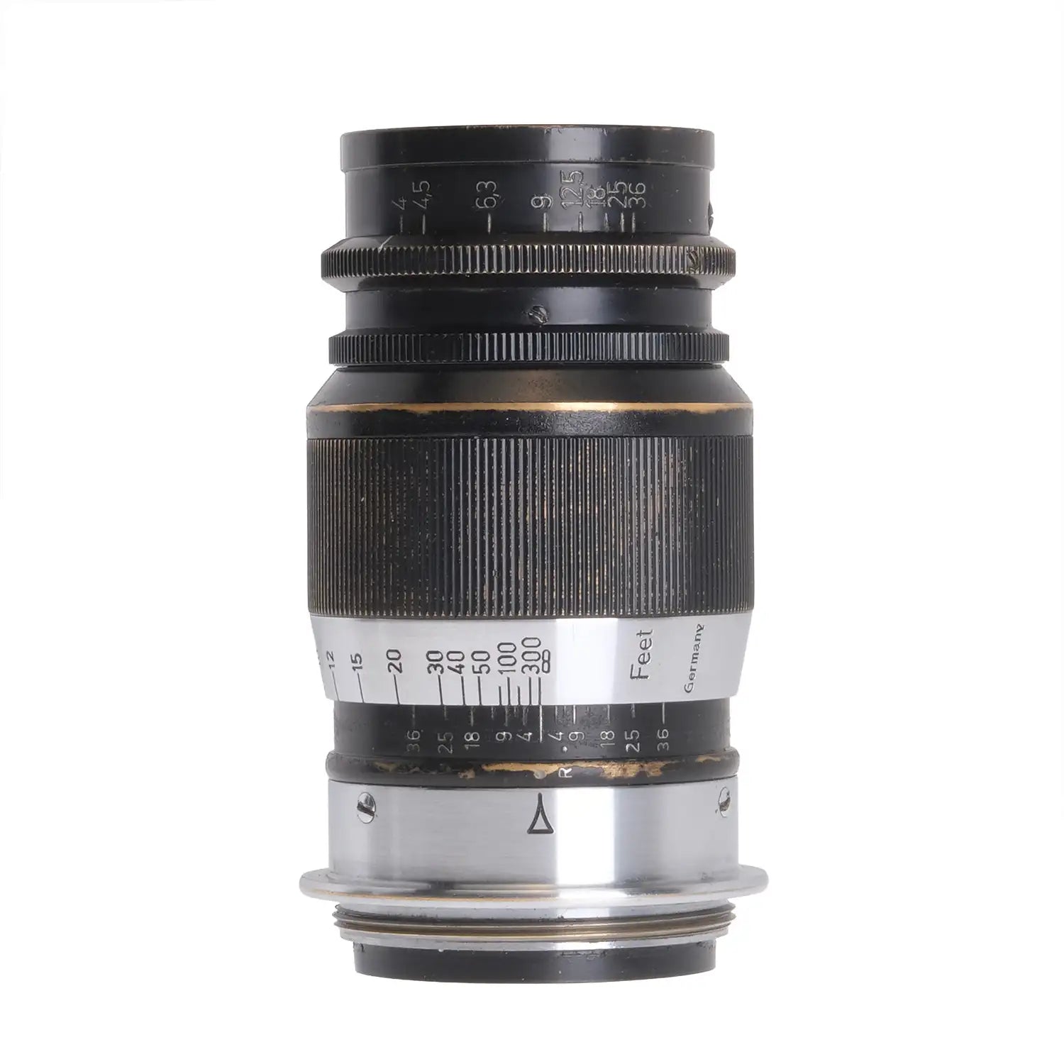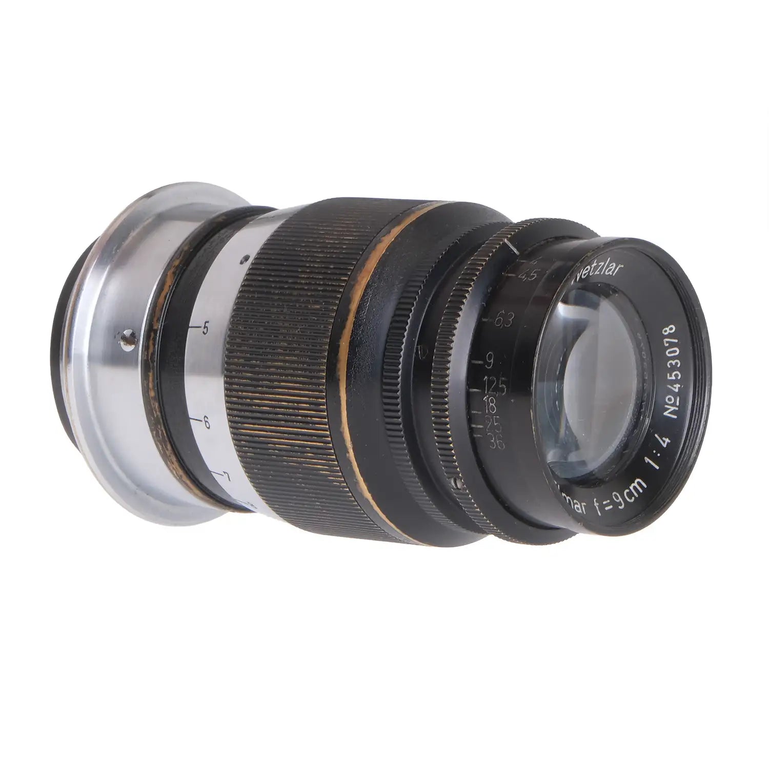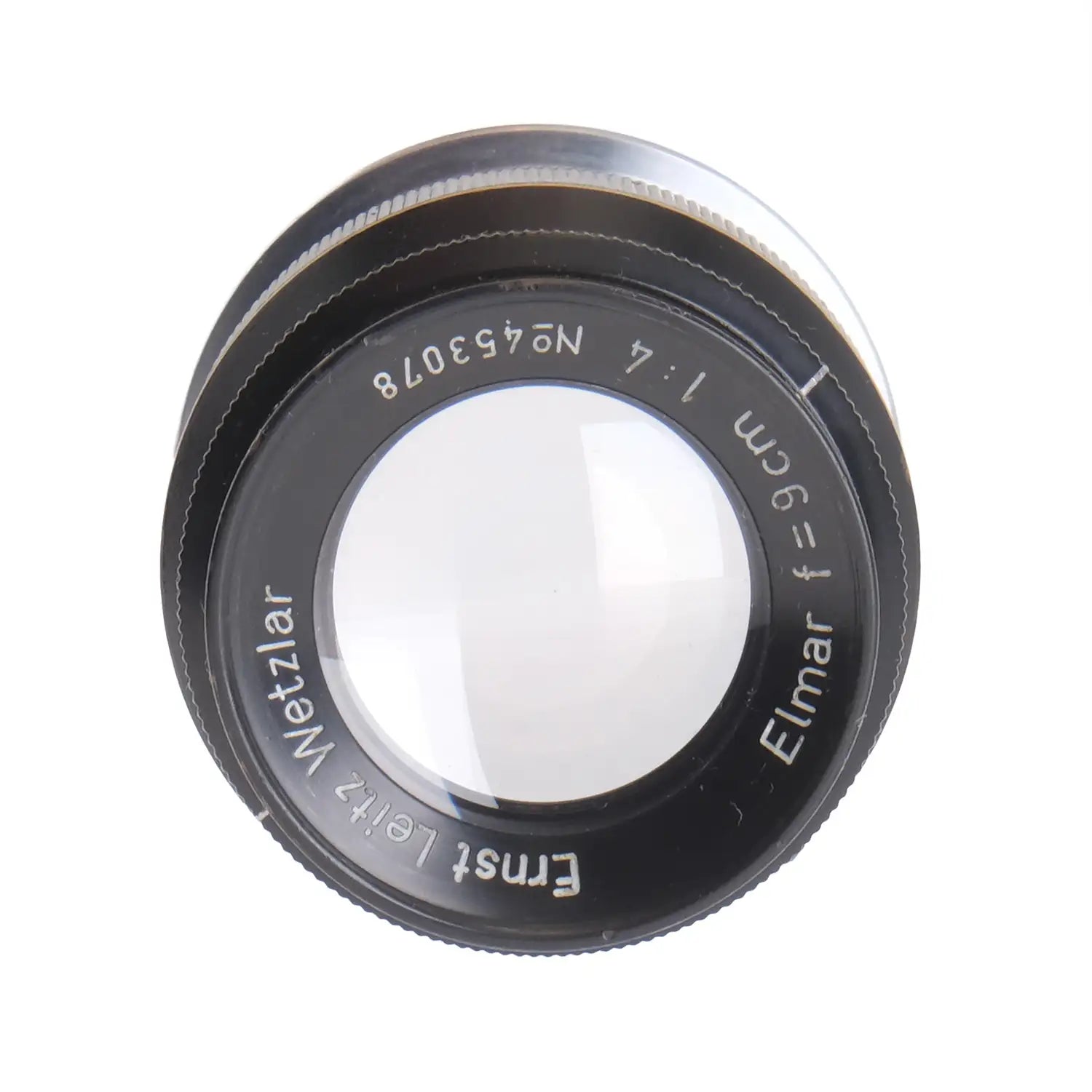 This Leica 9cm f4 Elmar SM Lens #453078, is in average cosmetic condition with heavy signs of handling wear found throughout, please see photos for visual reference. Cosmetically, this lens has been rated at a (8+) condition. This lens is in proper working order; the aperture and focus ring turn smoothly and the glass has faint haze which should not affect image quality. There are no signs of fungus or marks present. This lens comes with a front and rear cap only. This lens is ready for use!