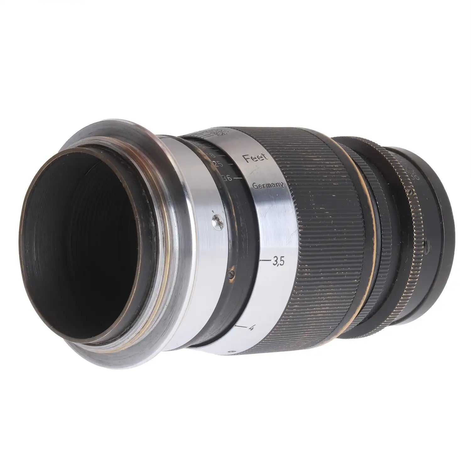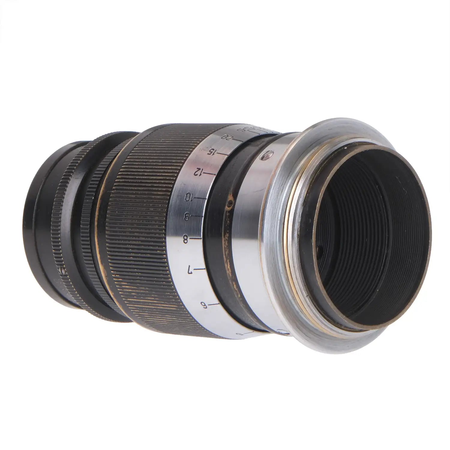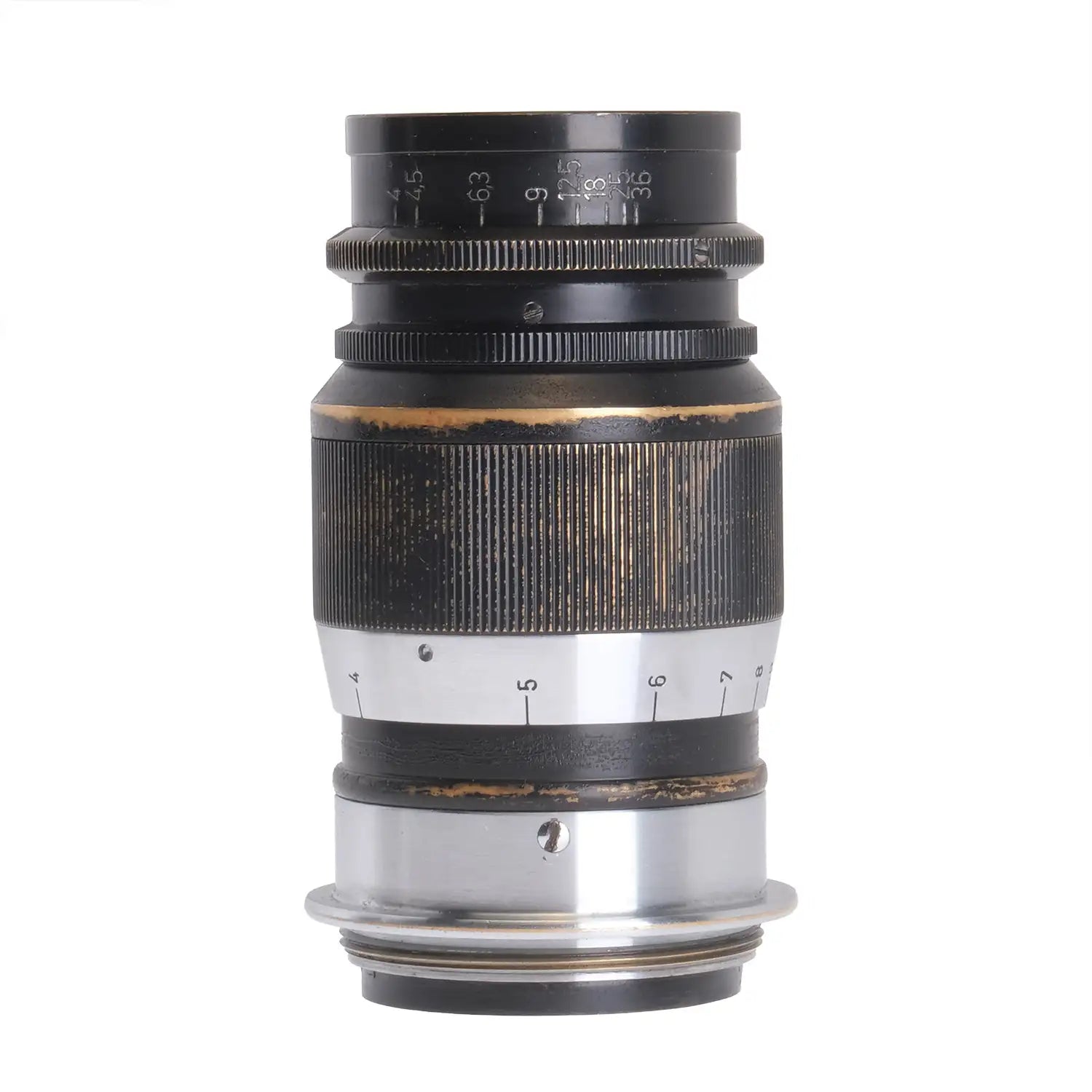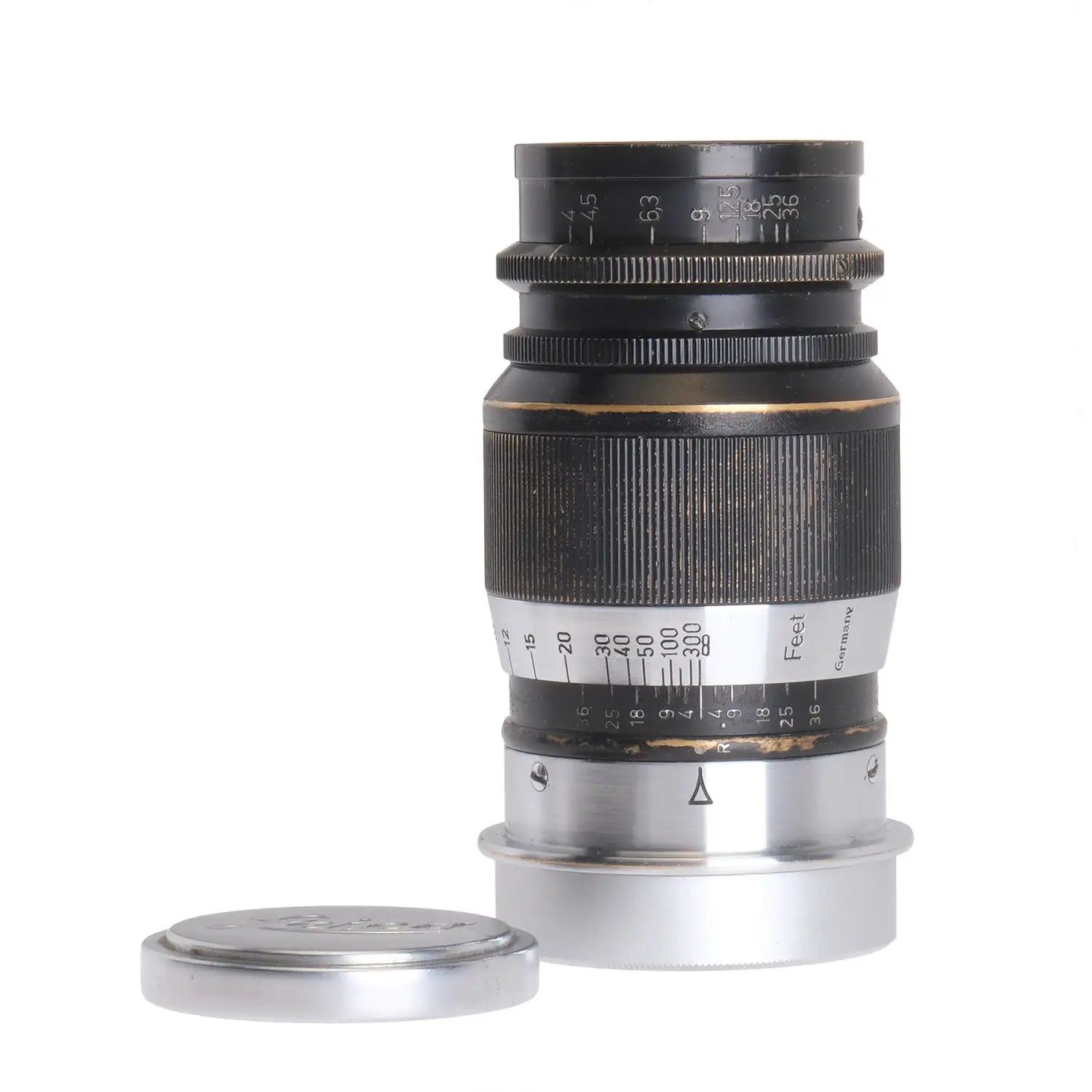 This Leica 9cm f4 Elmar SM Lens #453078, is in average cosmetic condition with heavy signs of handling wear found throughout, please see photos for visual reference. Cosmetically, this lens has been rated at a (8+) condition. This lens is in proper working order; the aperture and focus ring turn smoothly and the glass has faint haze which should not affect image quality. There are no signs of fungus or marks present. This lens comes with a front and rear cap only. This lens is ready for use!