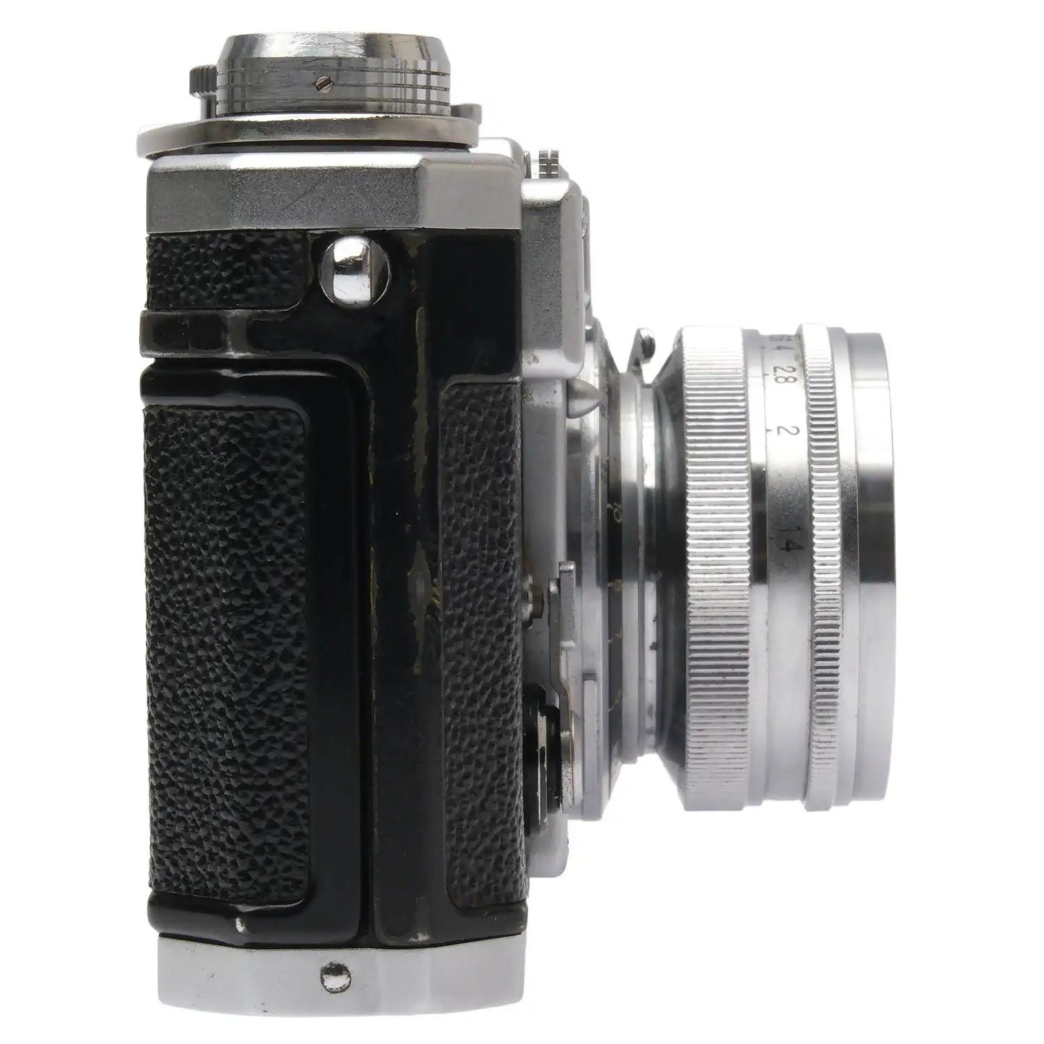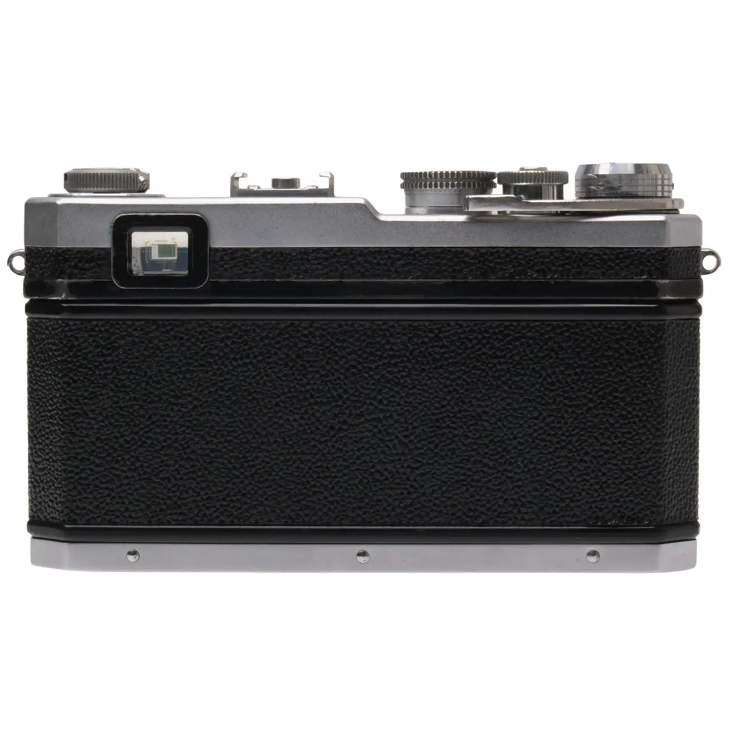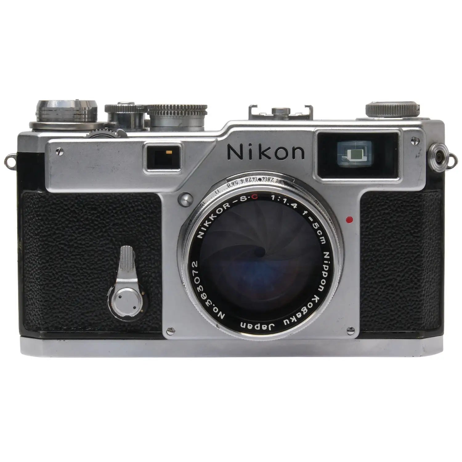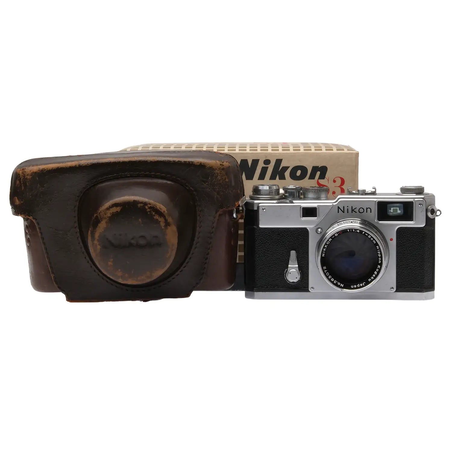 This Nikon S3 (Silver), #6300537, is in good condition with some handling wear. I rate it cosmetically an (8+). The camera is in proper working order; film advances properly, the viewfinder is clear, the framelines are bright, the shutter is accurate at all speeds, and the self-timer functions properly. The focus wheel is a bit stiff. The included Nikon 5cm f1.4 Nikkor-S.C lens, #363072, is in similar condition, also rated an (8+). The focus is smooth, but it does not lock at infinity. The aperture ring is smooth, the aperture functions properly, and the glass is clean and clear with no haze, marks, or fungus. This listing includes a two-piece leather Nikon case with a strap, but the leather is deteriorating. No lens caps or body cap are included. It also includes the original box. Please refer to the photos for details.