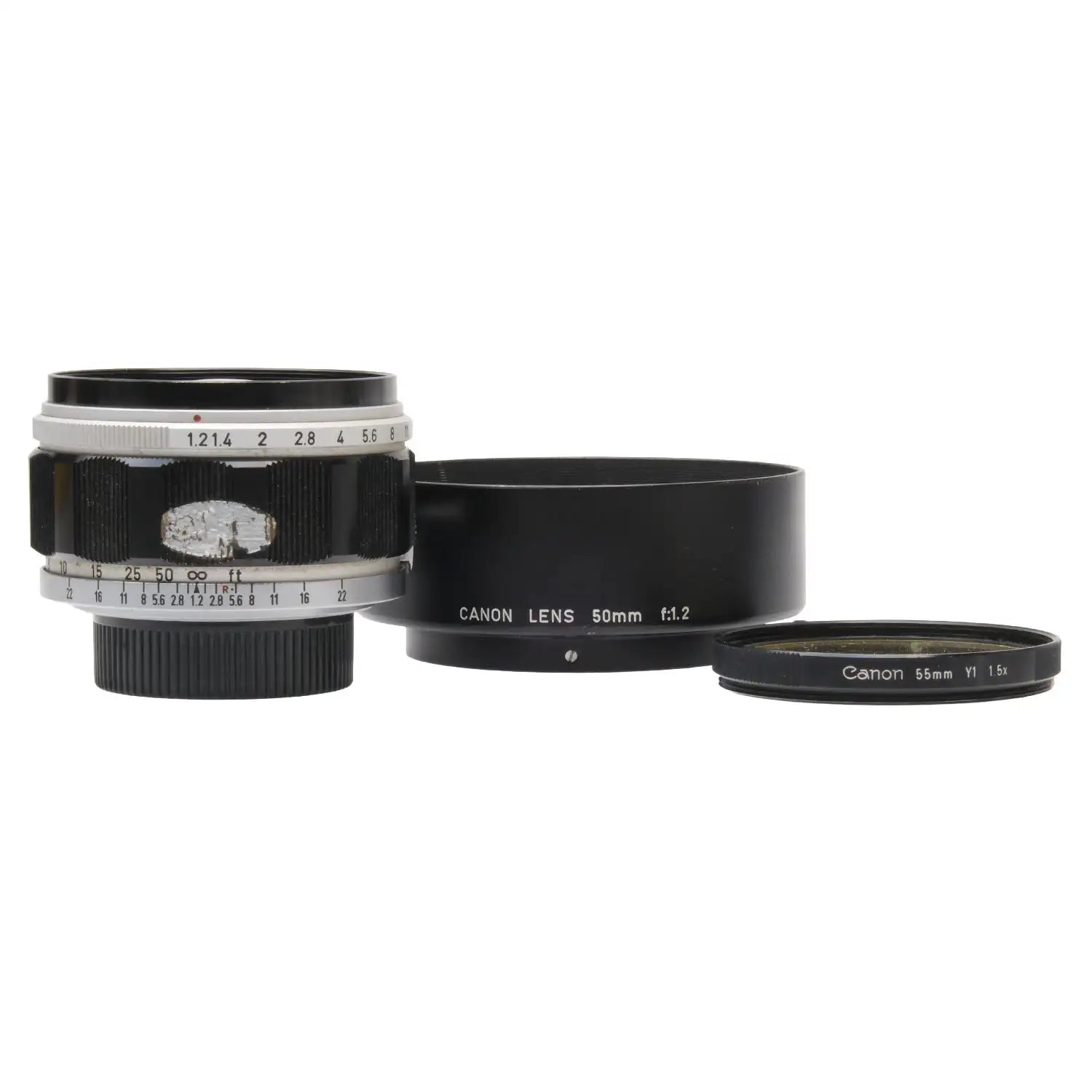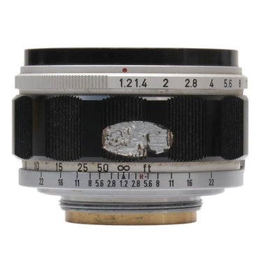 This Canon 50mm f1.2 Lens, #55136, is in good condition with some handling wear. I rate it cosmetically an (8+). The focus and aperture rings are a bit stiff, but the aperture functions properly and the glass is clean and clear with no haze, marks, or fungus. There are a few faint specks of dust inside, but they do not affect image quality. It includes a Canon lens hood, a Canon Y1 1.5x filter, and rear lens cap. It is for Leica screw mount/thread mount (LTM) and other E39 bodies. Please refer to the photos for details.
