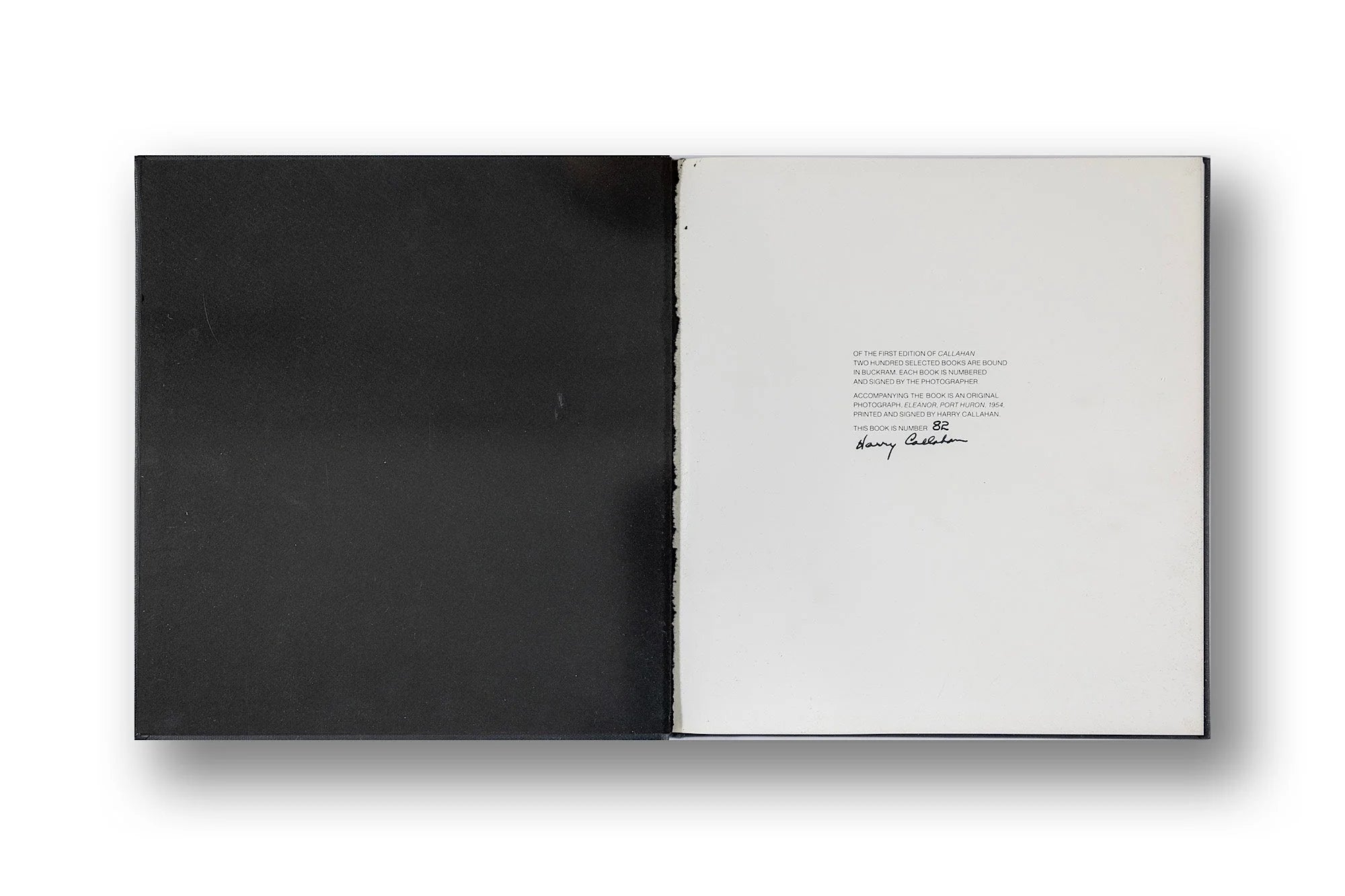 • Notes: Mint, Signed and numbered 82 by the photographer. The book was originally offered with a B&W print, which is not included. Black page with print is gone. The book includes original slipcase as well as the original cardboard packing material that is labeled "Callahan Limited #82"