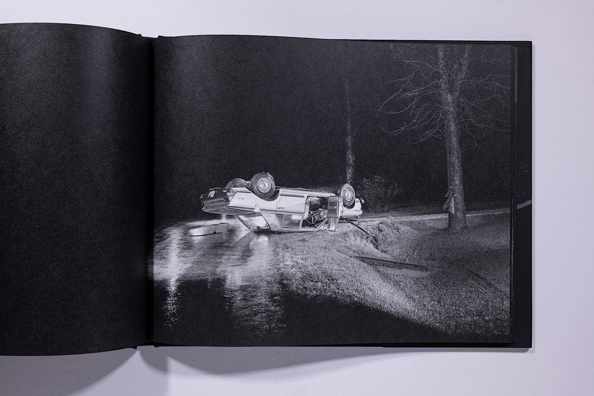 Boltz’s nighttime photographs have a richness similar to that of 1930s black-and-white crime films. I like to think he may have been an admirer of movies like Scarface, with Paul Muni, and The Public Enemy, starring James Cagney. Each car is lit with a nightmarish, chiaroscuro quality. His framing matches the technique of horror and suspense films in which shadows provide gloomy details of the surroundings. The photographs remind me of genres where light and dark represent good and evil. This book is a hymn to unsolved mysteries discovered in the dead of night.