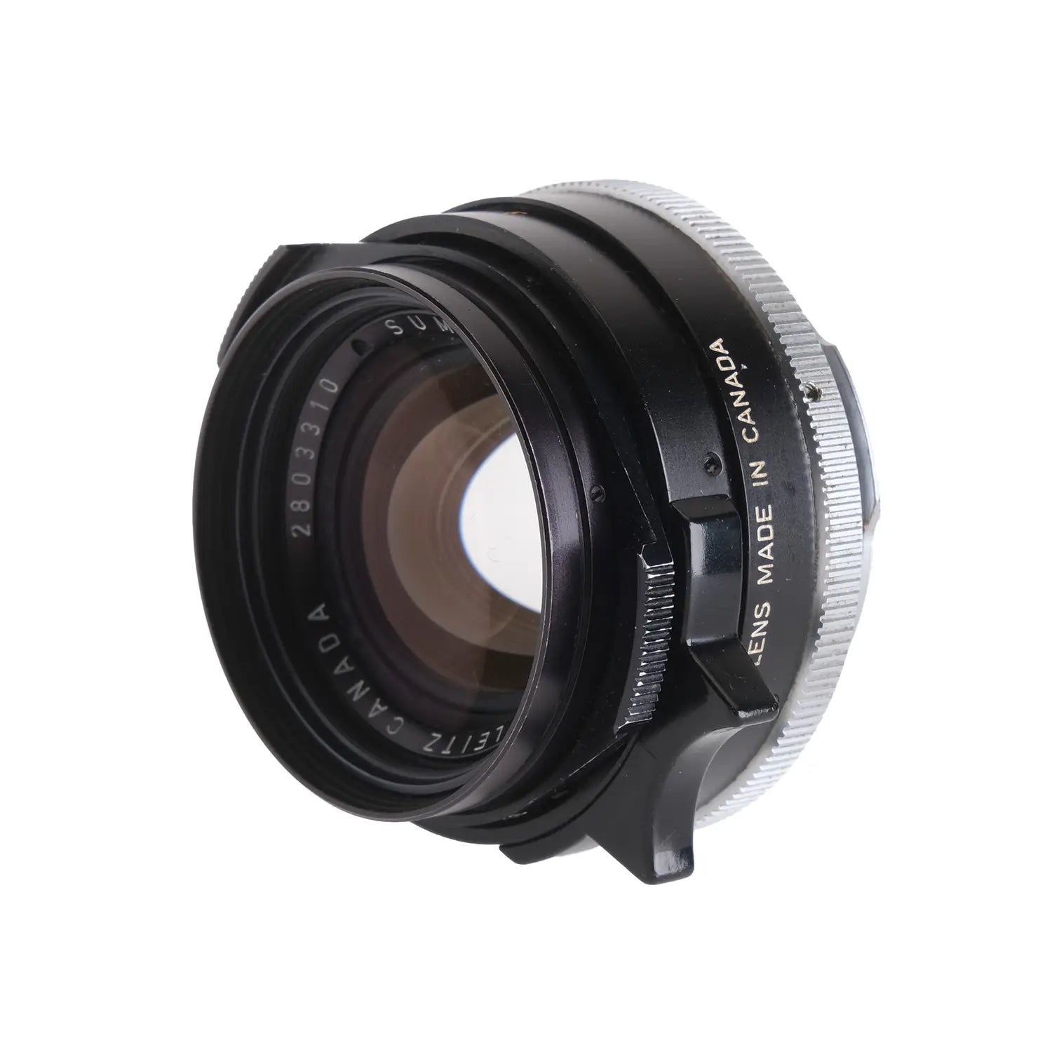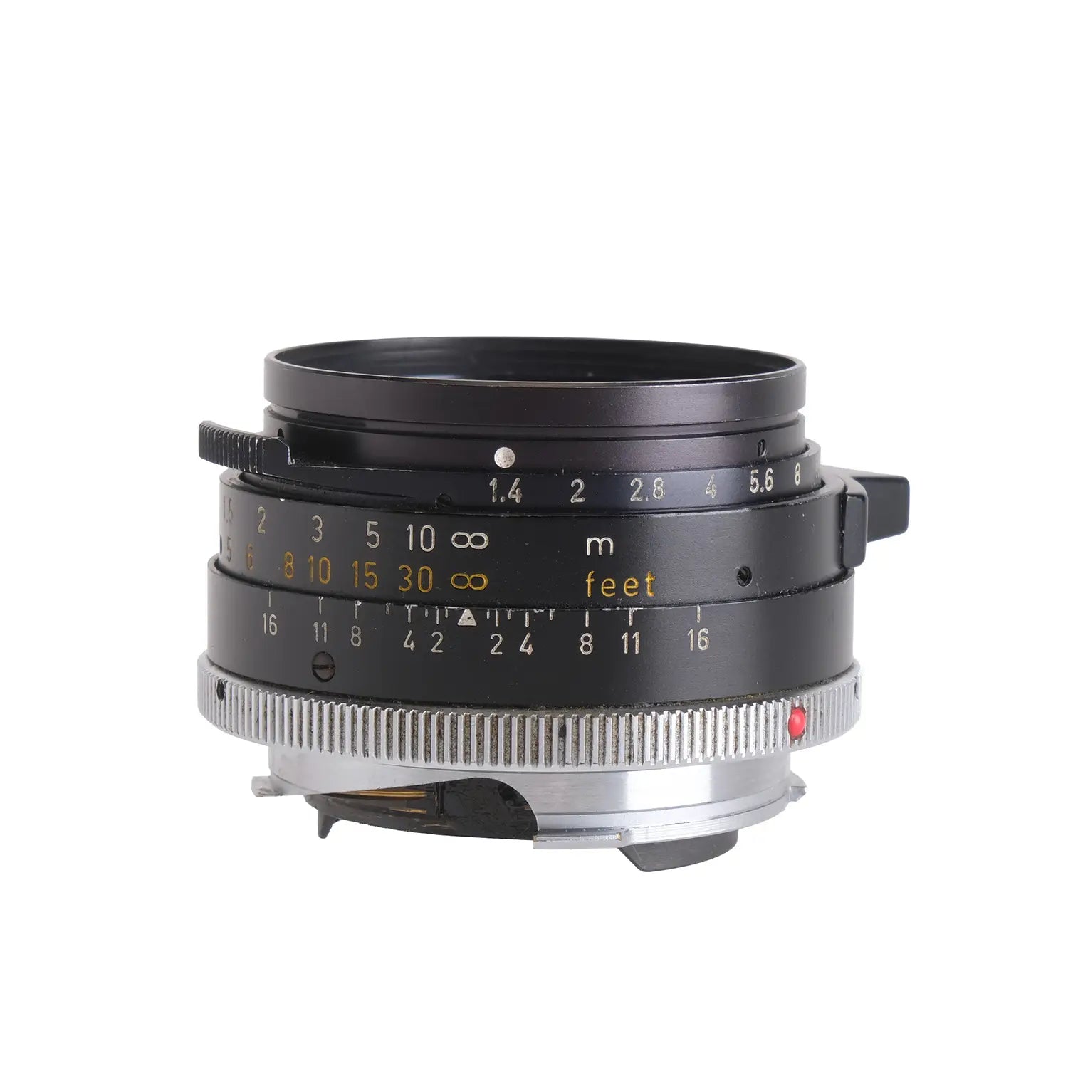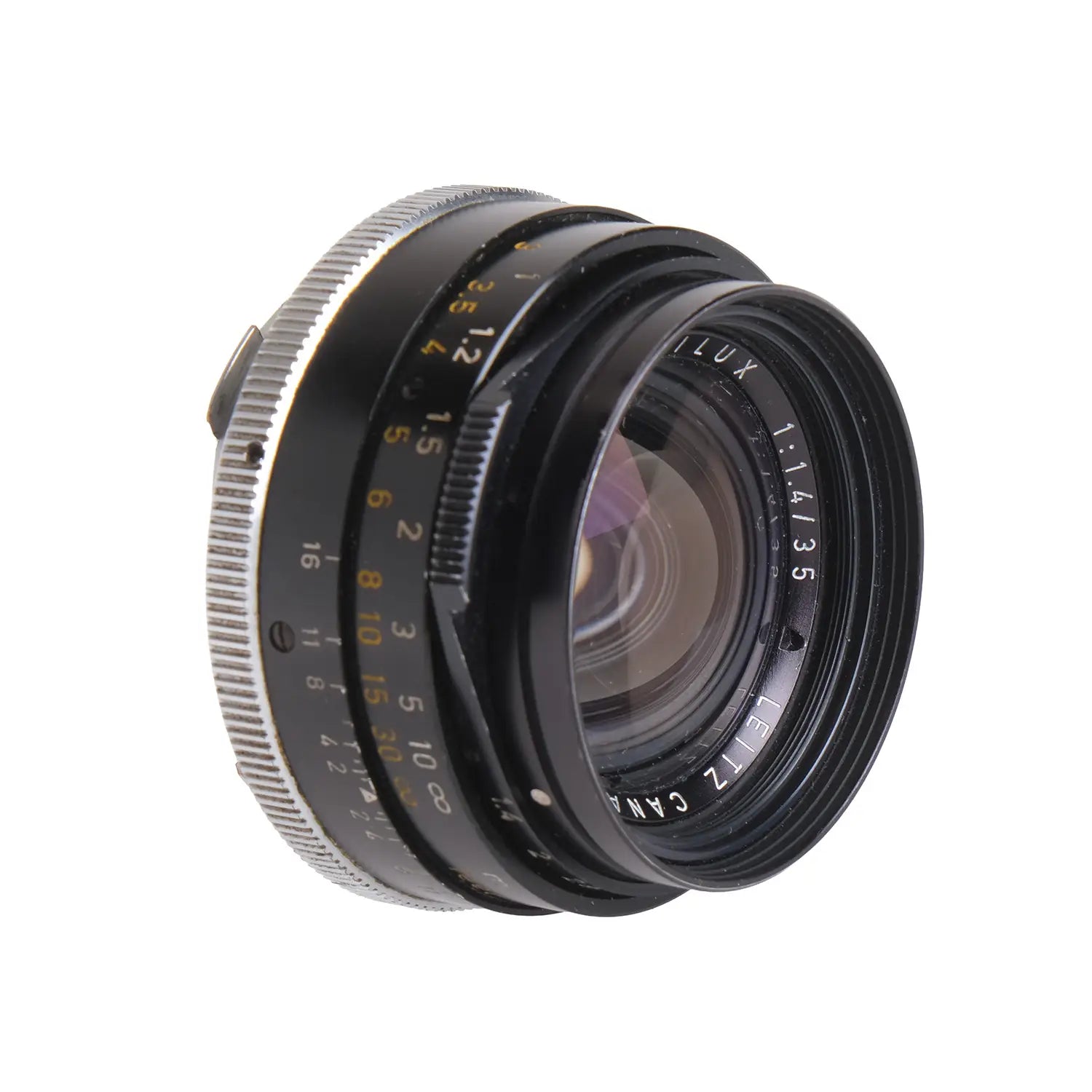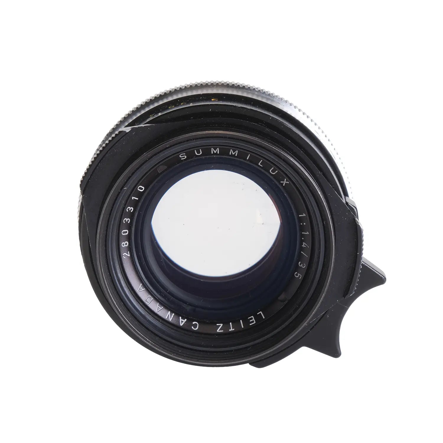 This Leica 35mm f1.4 Summilux Lens #2803310, is in average cosmetic condition with heavy signs of handling wear found throughout, please see photos for visual reference. Cosmetically, this lens has been rated at a (8+) condition. This lens is in proper working order; the aperture and focus turn smoothly, and the glass has faint haze which will not affect image quality. There are no signs of fungus or marks present. This lens comes with a front and rear cap. This lens is ready for use!