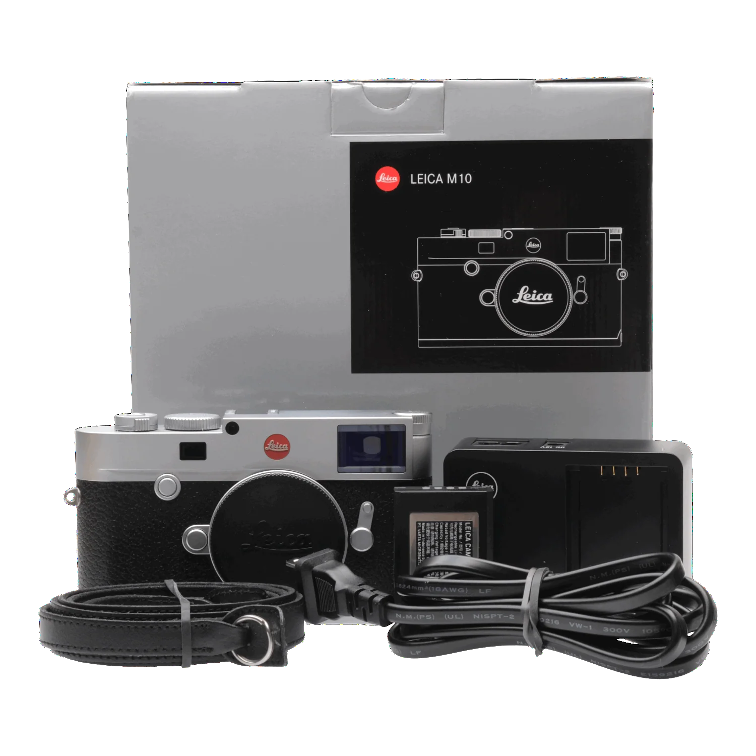This Leica M10 (Silver), #5153099, is in great condition with minor handling wear. I rate it cosmetically a (9+). The camera is in proper working order; the viewfinder is clear, the sensor is unmarked, the memory card slot reads & writes, and the rangefinder is bright & accurate. This camera includes a Leica battery, battery charger, charging cables, neck strap, body cap, and the original instructions & box. Please refer to the photos for details.