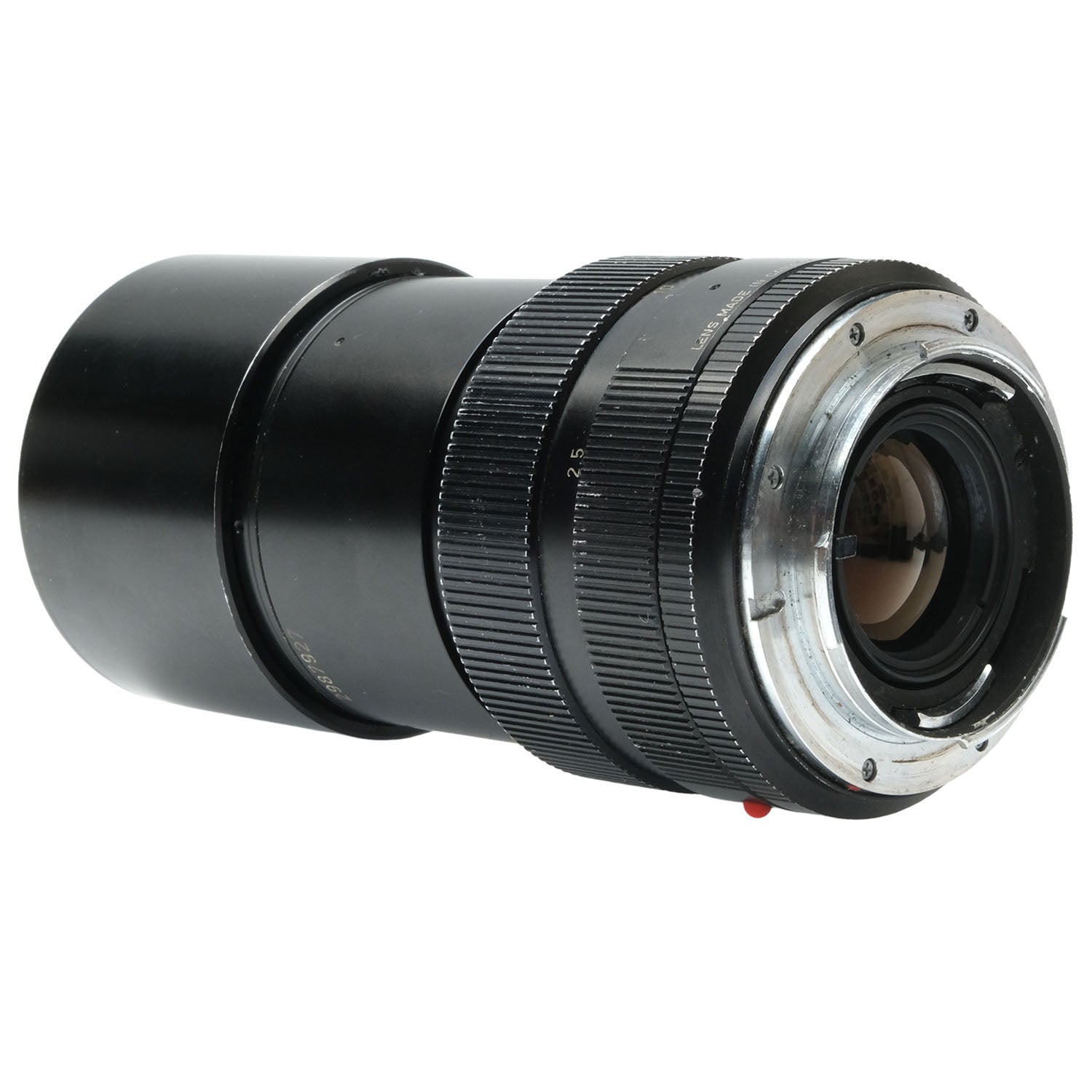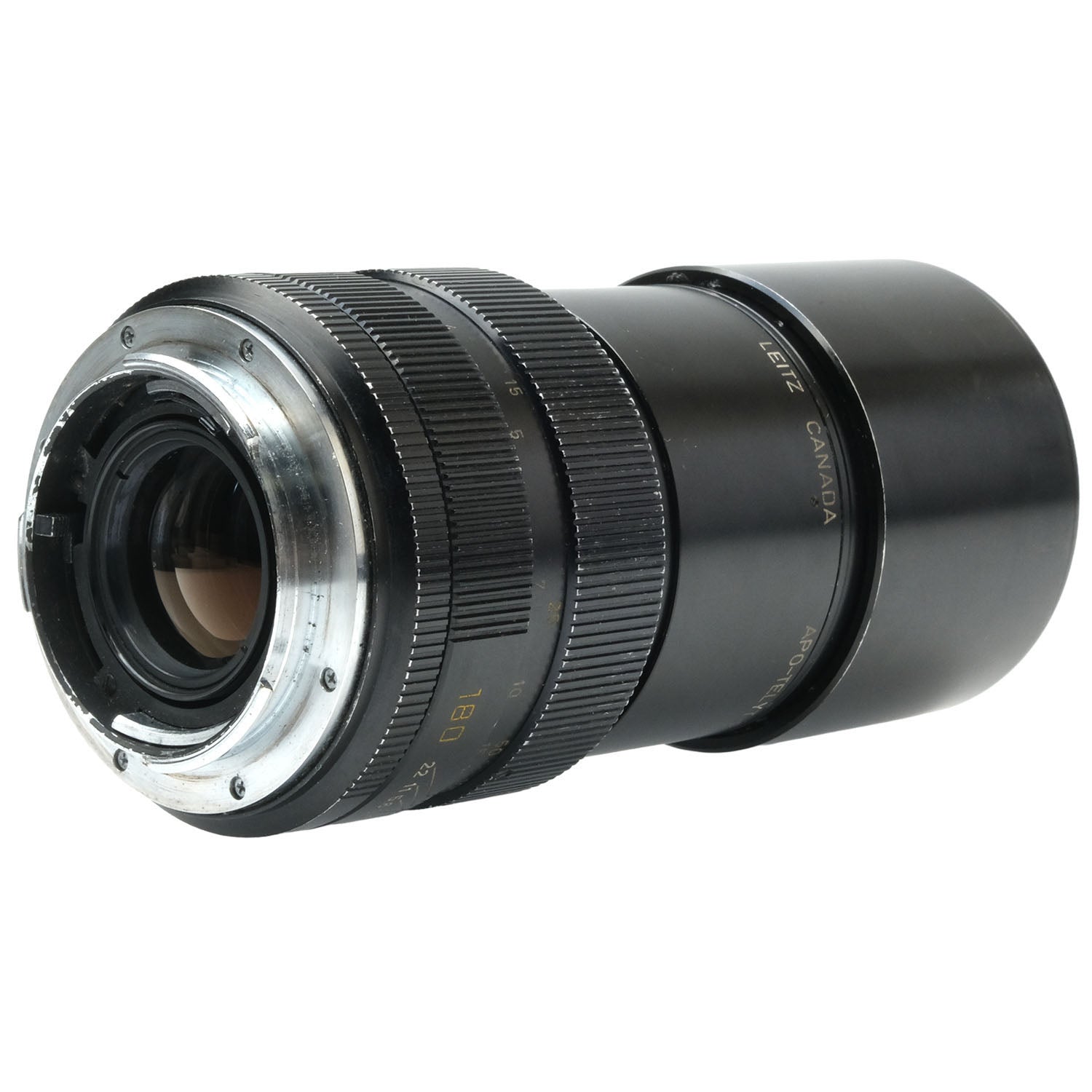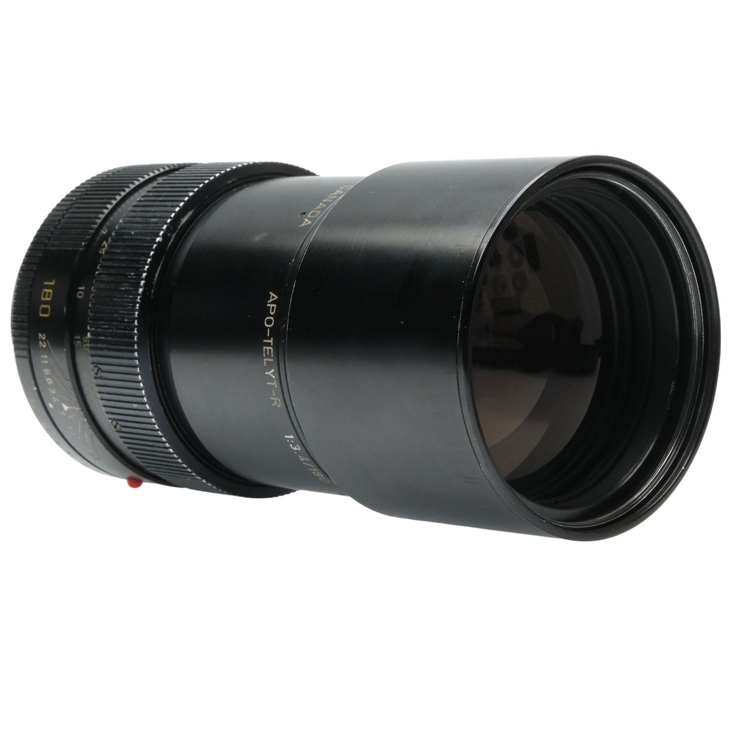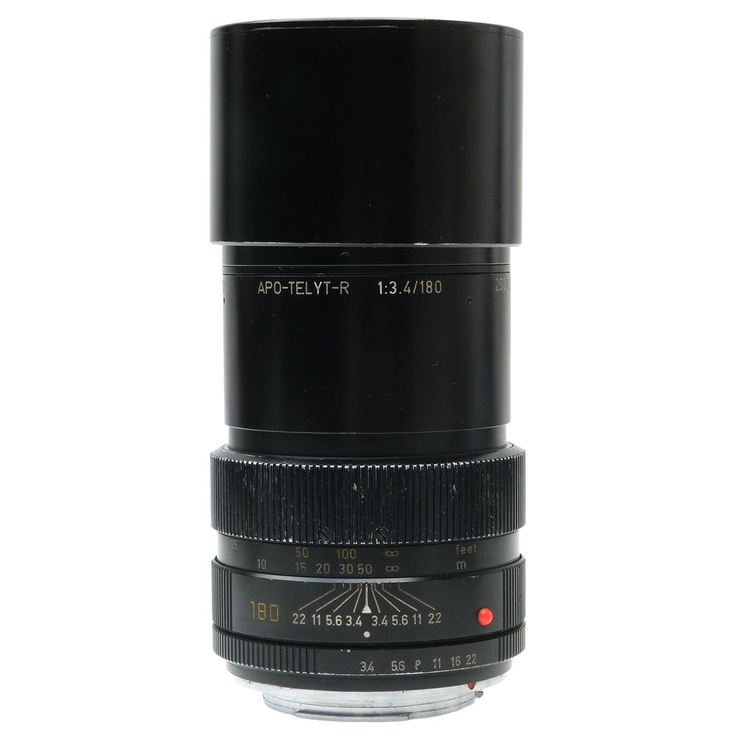 This Leica 180mm f3.4 APO-Telyt-R Lens (3-Cam), #2987927, is in fair condition with heavy handling wear. I rate it cosmetically a (7+). The focus ring is smooth, but the aperture ring is a bit jerky. The aperture functions properly, and the glass has no marks or fungus. There's some faint edge haze and slight dust inside, but it does not affect image quality. This lens includes front & rear caps.