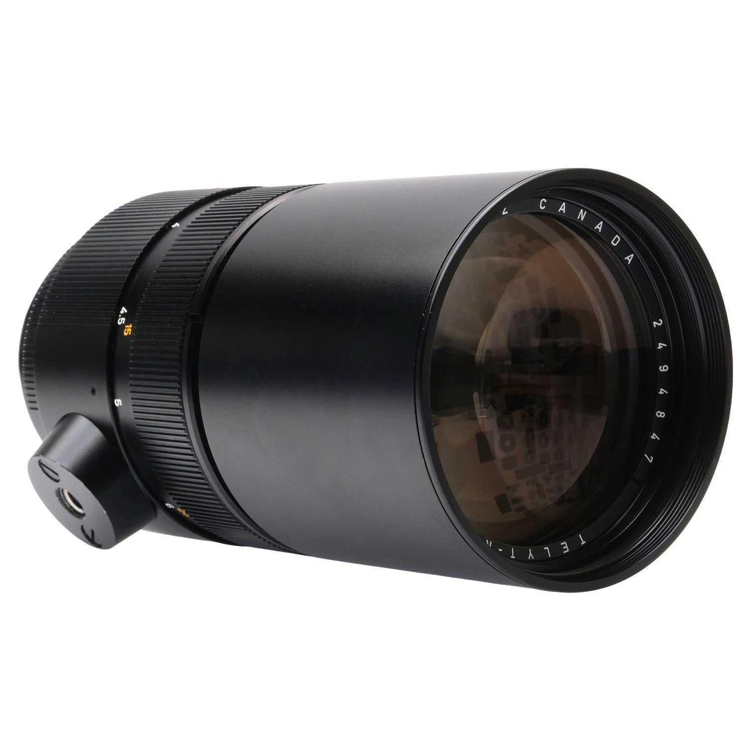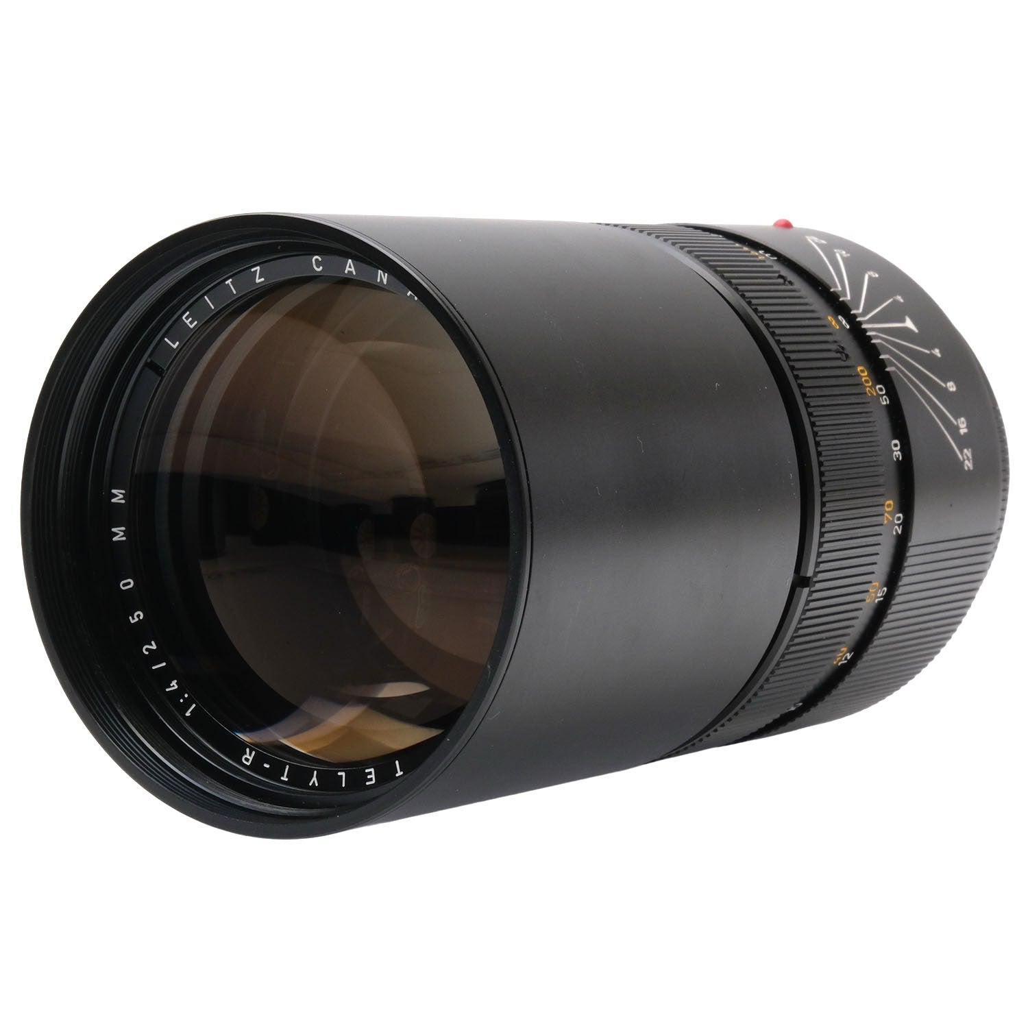 This Leica 250mm f4 Telyt-R Lens, #2494847, is in great condition with minor handling wear. I rate it cosmetically a (9). The focus and aperture rings are smooth, the aperture functions properly, and the glass is clean and clear with no haze, marks, or fungus. There are a few faint specks of dust inside, but they do not affect image quality. This lens includes front & rear caps.