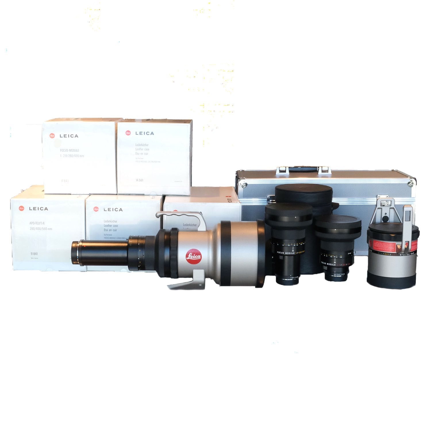 This Leica Modular set comes with both lens heads and all three focusing modules. Included are 280/400/560mm lens head, boxed (3797829), 400/560/800 lens head (3757217), 1x focus module, boxed (3735173), 1.4x focus module (3735333, 2x focus module (3754897). Also included are the fitted hard carry case for the 400mm lens head and focus module, leather cases for all three focus modules. All of the glass is clean and clear with no haze, marks or fungus. The focus on all modules is smooth and all of the apertures work well. Cosmetically, this only shows faint handling wear. We have it rated at (9+). This is a super clean and well sorted Modular set, ready for a new home.
