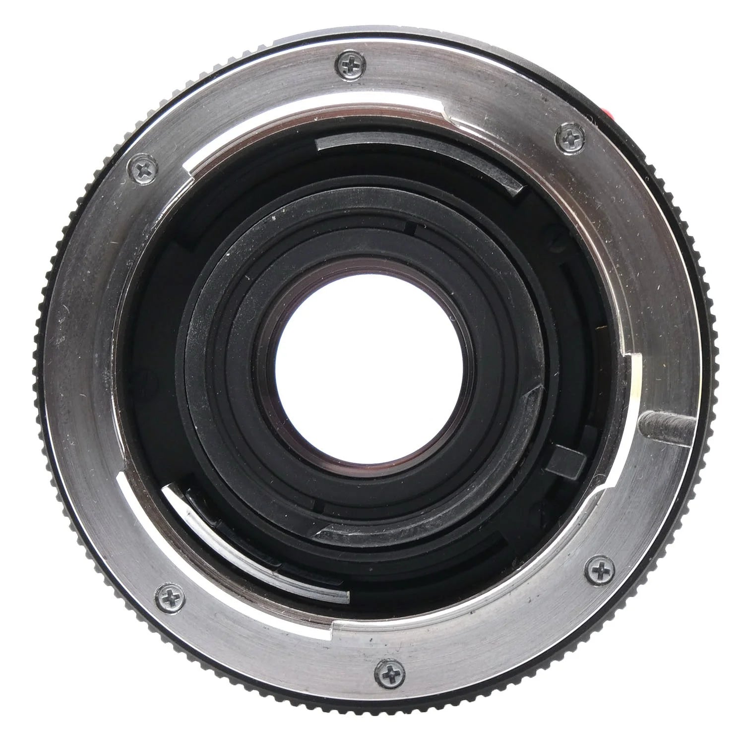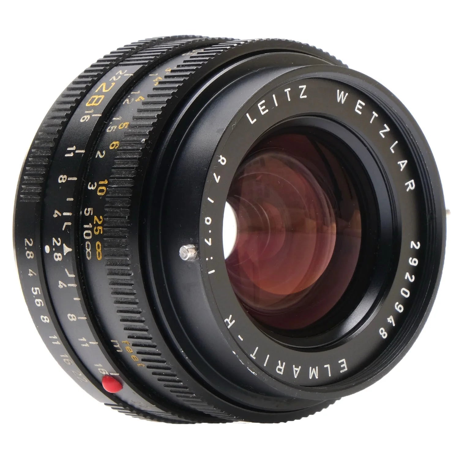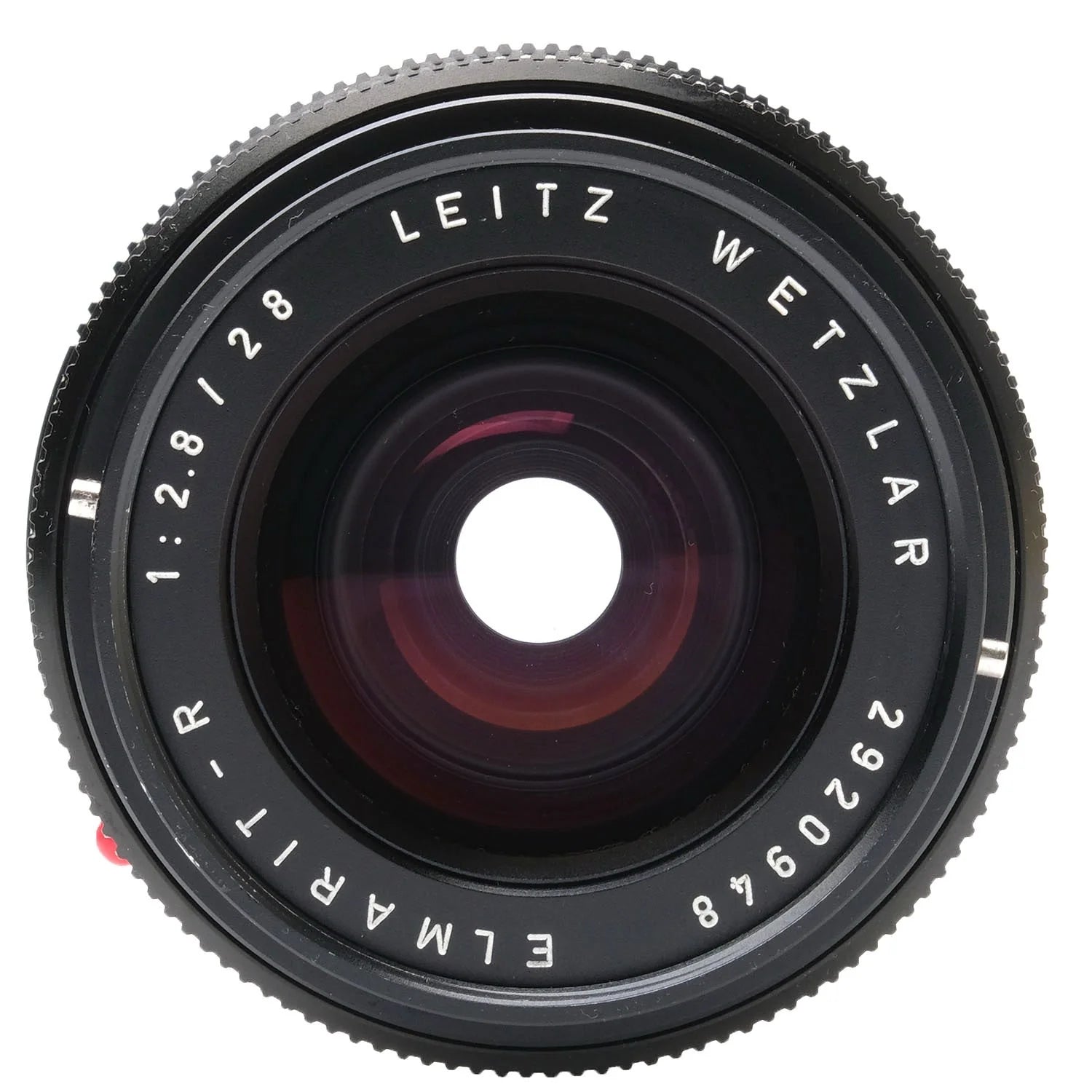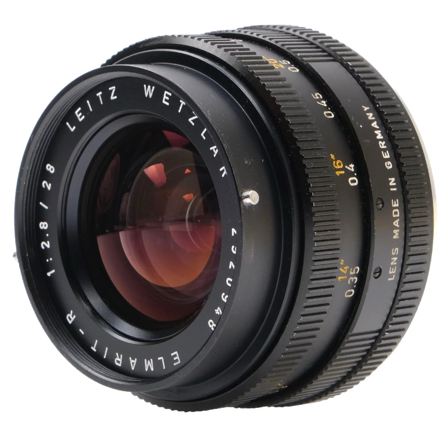 This Leica 28mm f2.8 Elmarit-R Lens, #2920948, is in good condition with some handling wear. I rate it cosmetically an (8+). The aperture ring is smooth, but the focus ring is very stiff. The aperture functions properly and the glass is clean and clear with no haze, marks, or fungus. There are a few faint specks of dust inside, but they do not affect image quality. This lens includes a Leica lens hood and a rear lens cap, but no front cap. Please refer to the photos for details.
