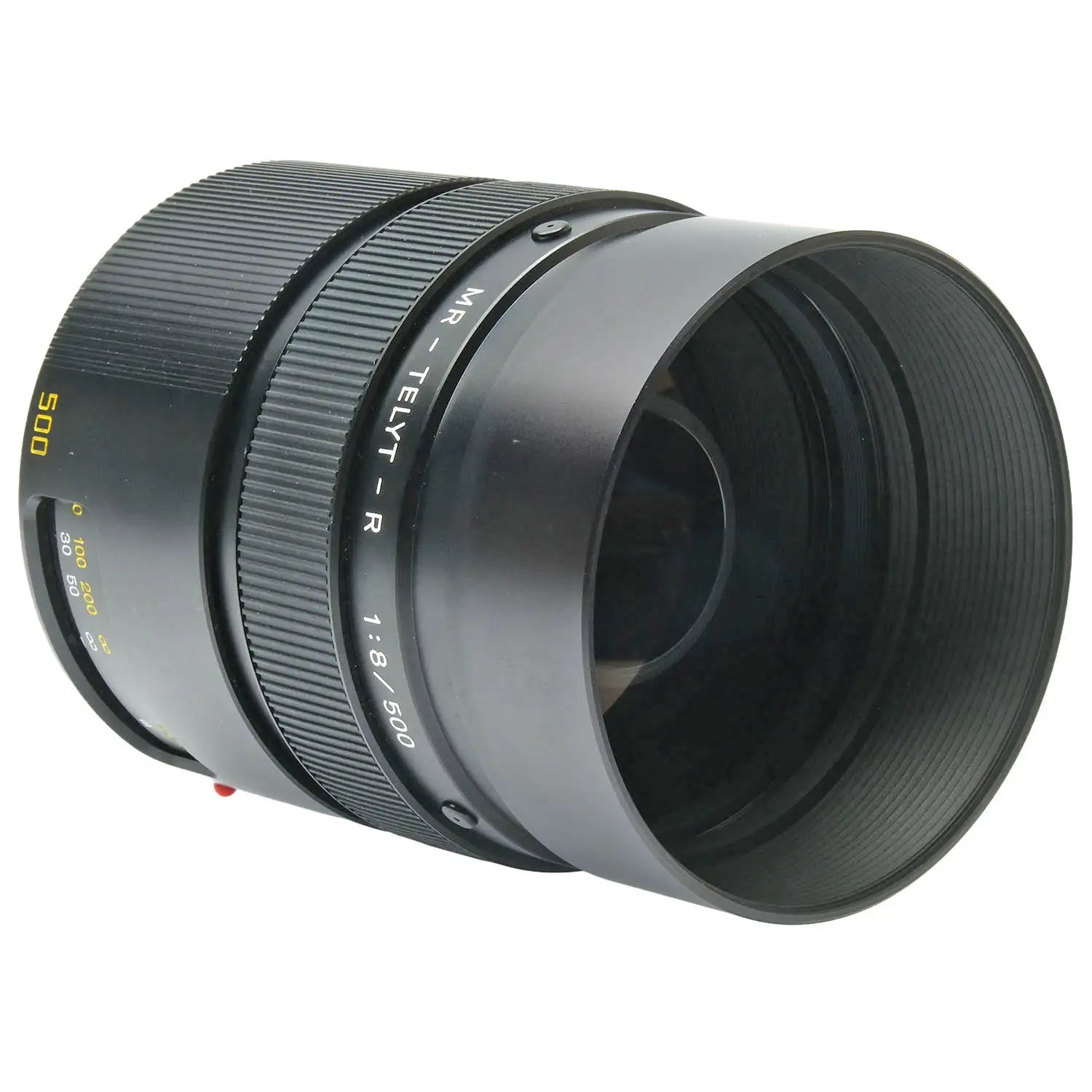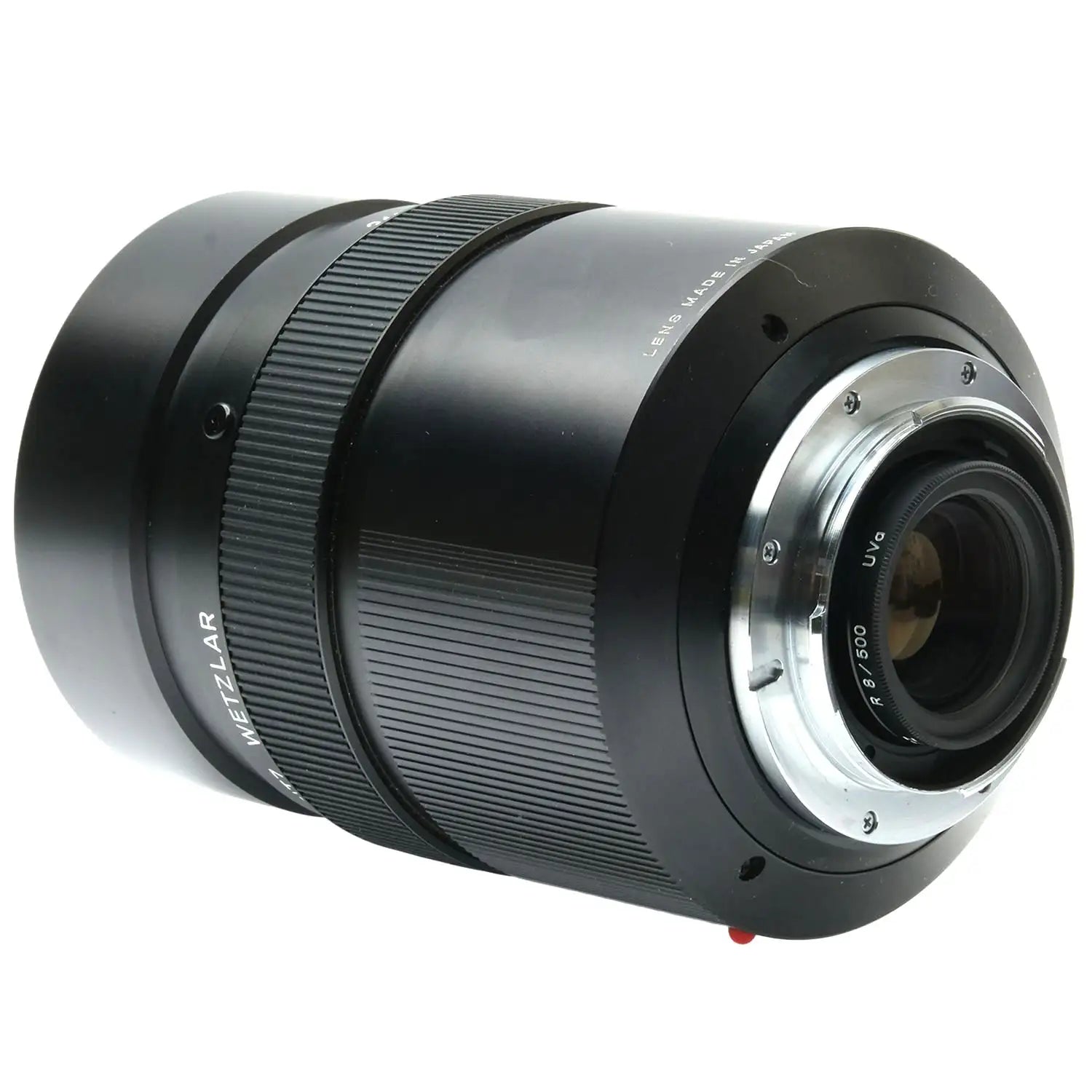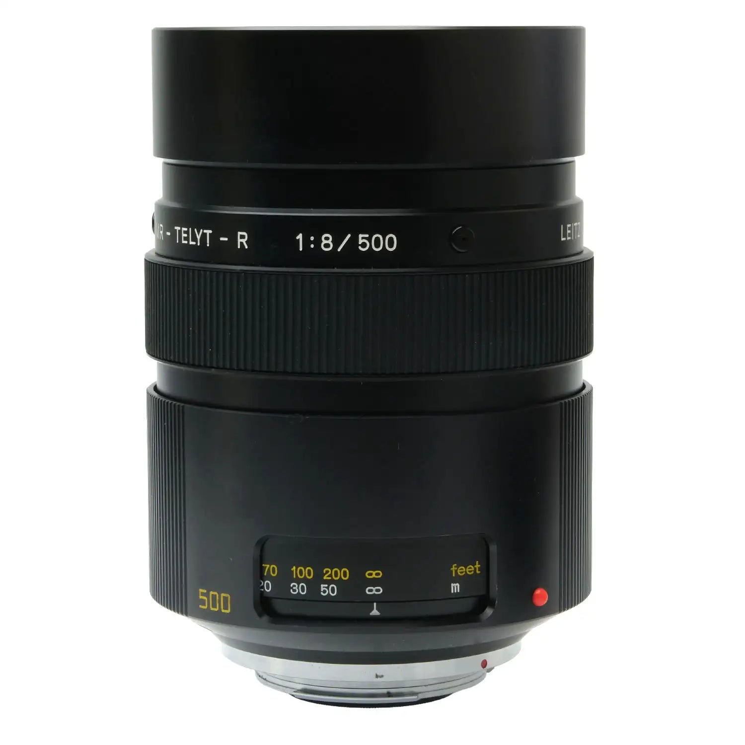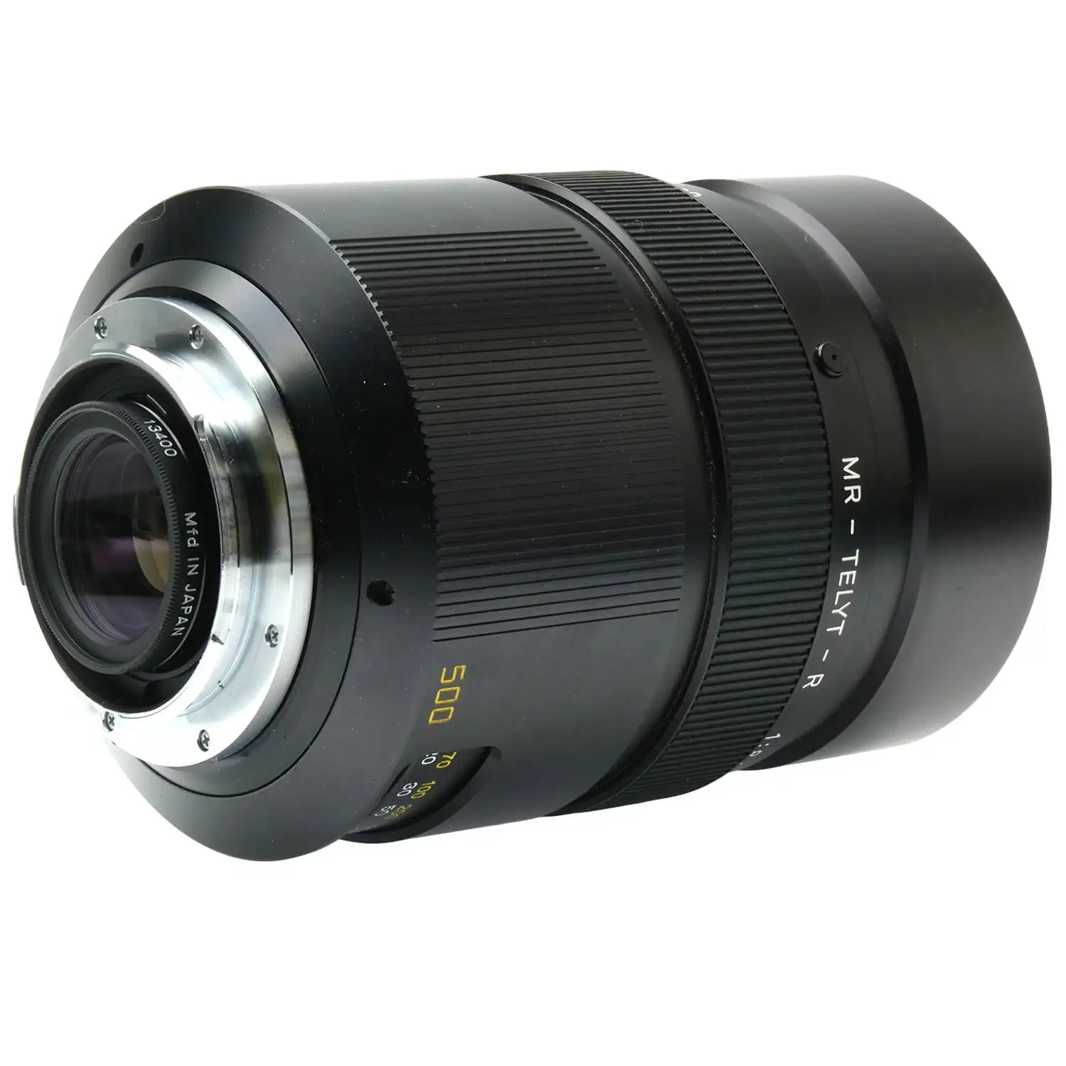 This Leica 500mm f8 MR-Telyt-R Mirror Lens, #3139160, is in great condition with minor handling wear. I rate it cosmetically a (9+). The focus ring is a bit stiff, but the aperture functions properly and the glass is clean and clear with no haze, marks, or fungus. There are a few faint specks of dust inside, but they do not affect image quality. This lens includes front & rear caps.