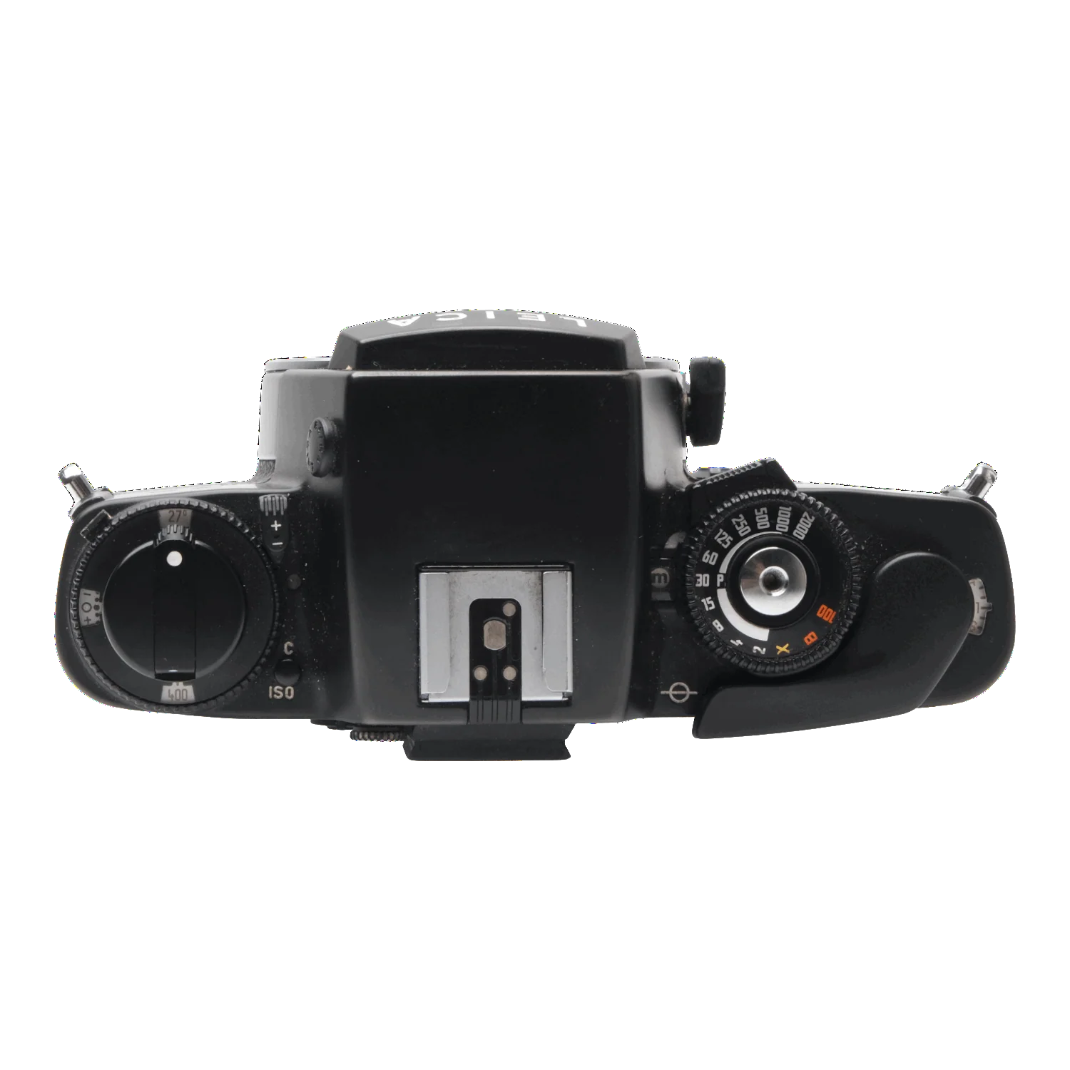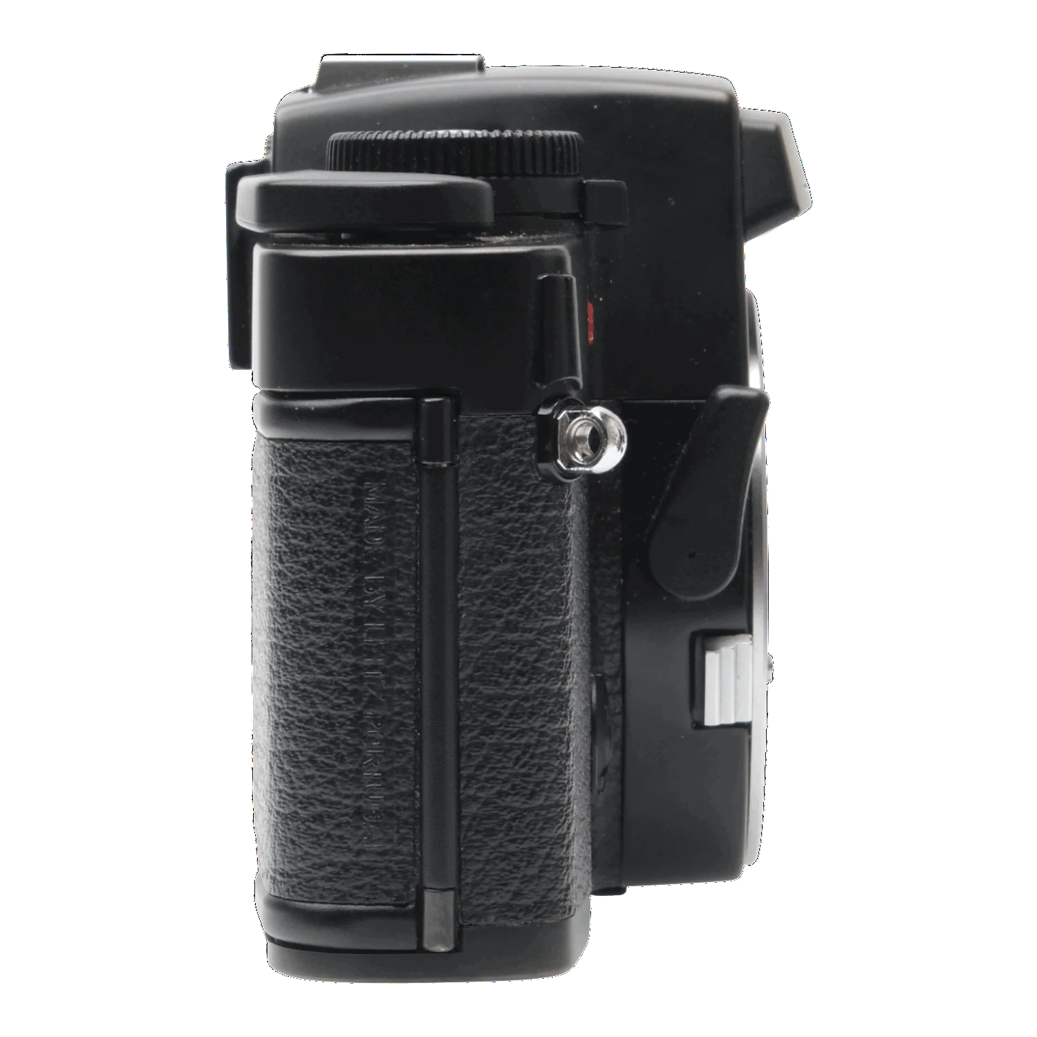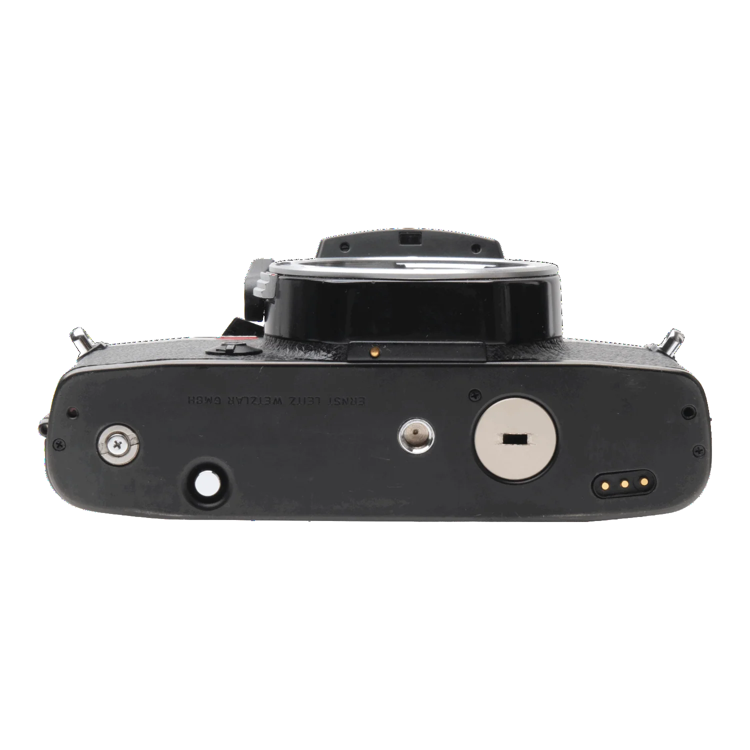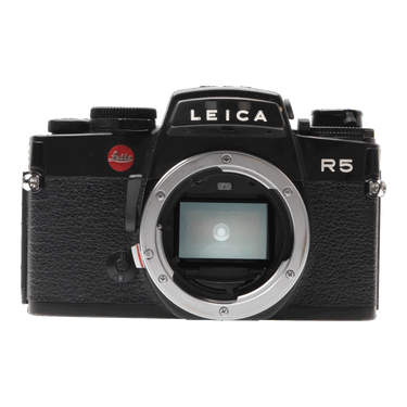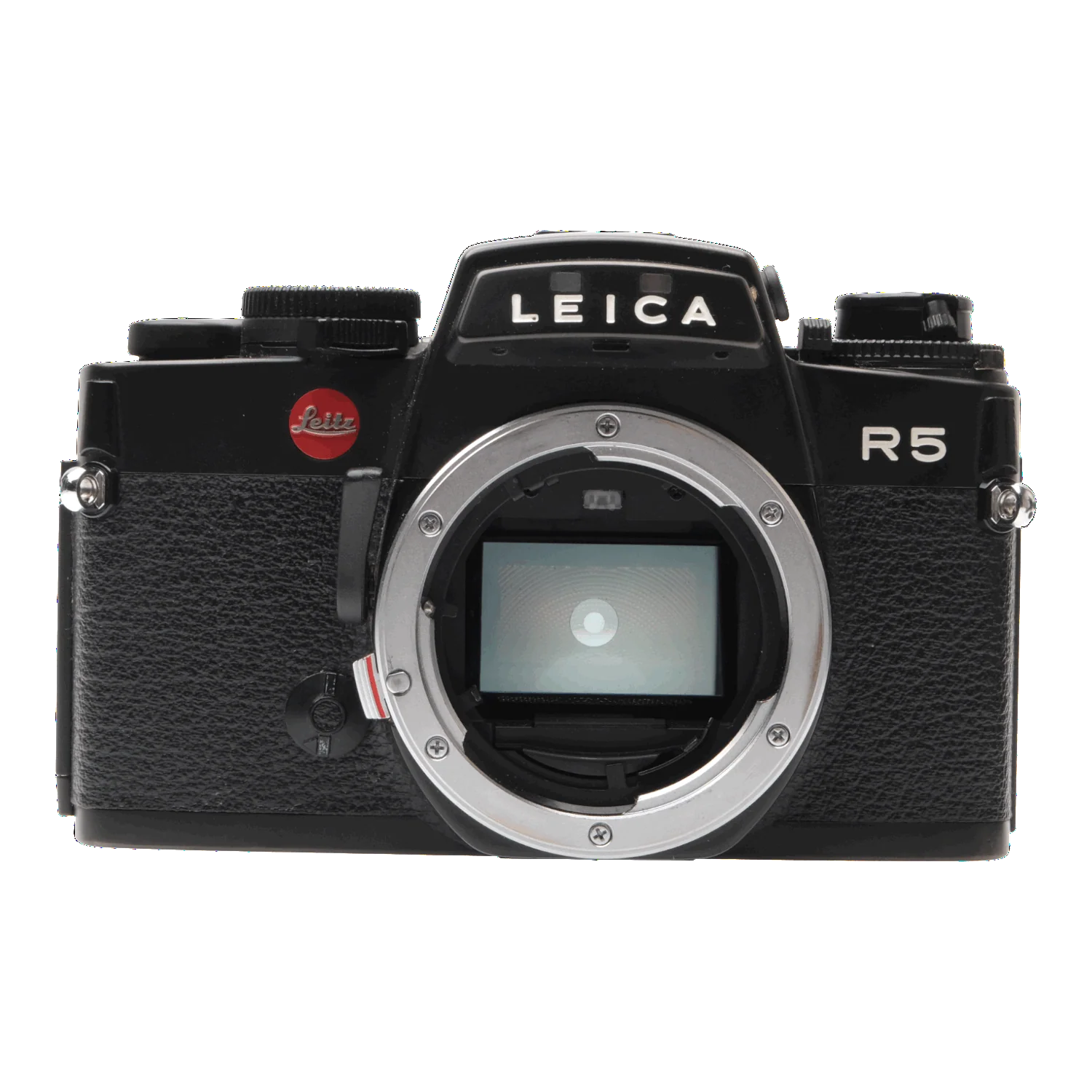 This Leica R5 (Black), #1698850, is in great condition with minor handling wear. I rate it cosmetically a (9). The camera is in proper working order; film advances properly, the shutter is accurate at all speeds, the meter & self-timer function, and the battery compartment is corrosion-free. The viewfinder has some faint specks inside, but is otherwise clear. This camera includes a body cap. It uses either two (2) 1.5V batteries or one (1) 3V battery (not included). Please refer to the photos for details.