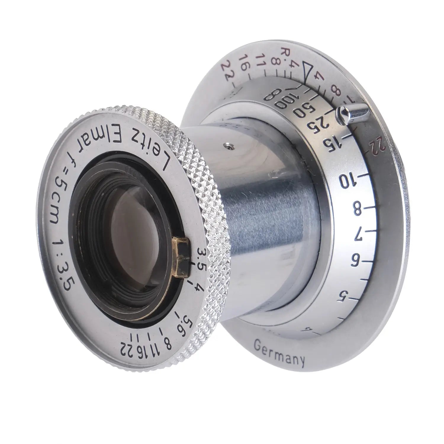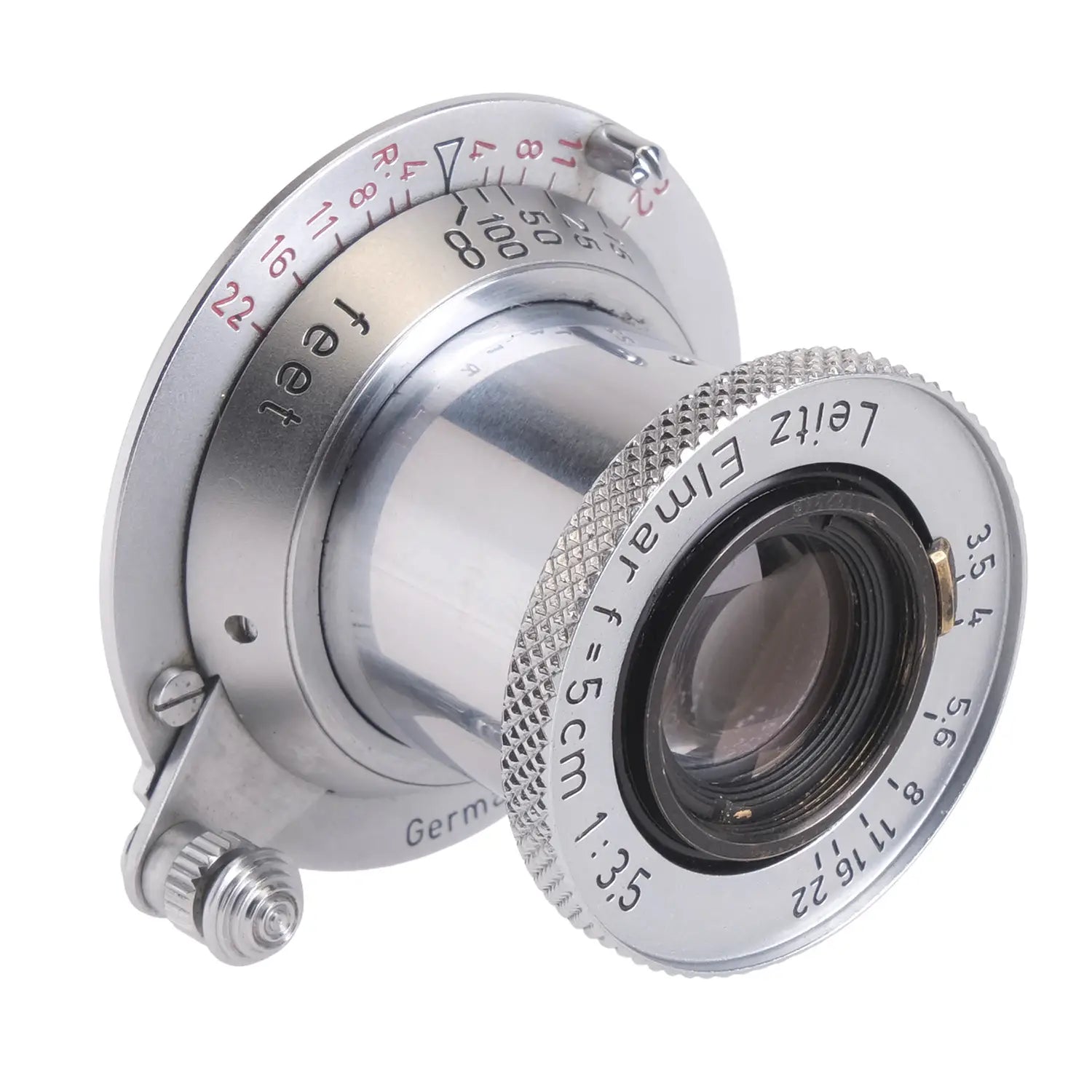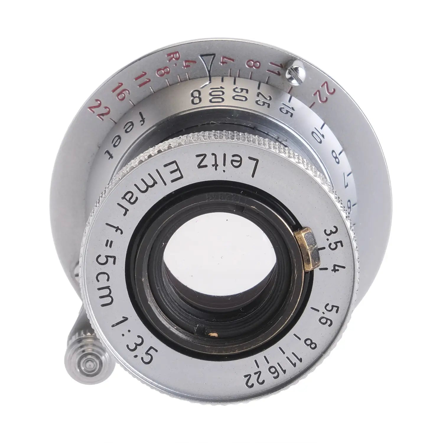 This Leica 5cm f3.5 Elmar SM Lens #1122948, is in excellent cosmetic condition with slight signs of handling wear found throughout, please see photos for visual reference. Cosmetically, this lens has been rated at a (9+) condition. This lens is in proper working order; the aperture and focus turn smoothly, and the glass has faint haze which should not affect image quality. There are no signs of fungus or marks present. This lens comes with a rear cap only and is ready for use!