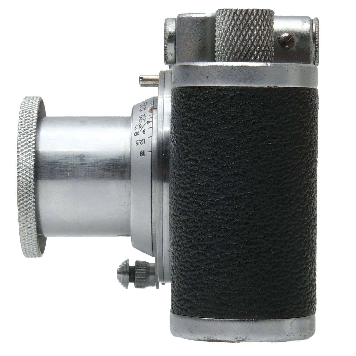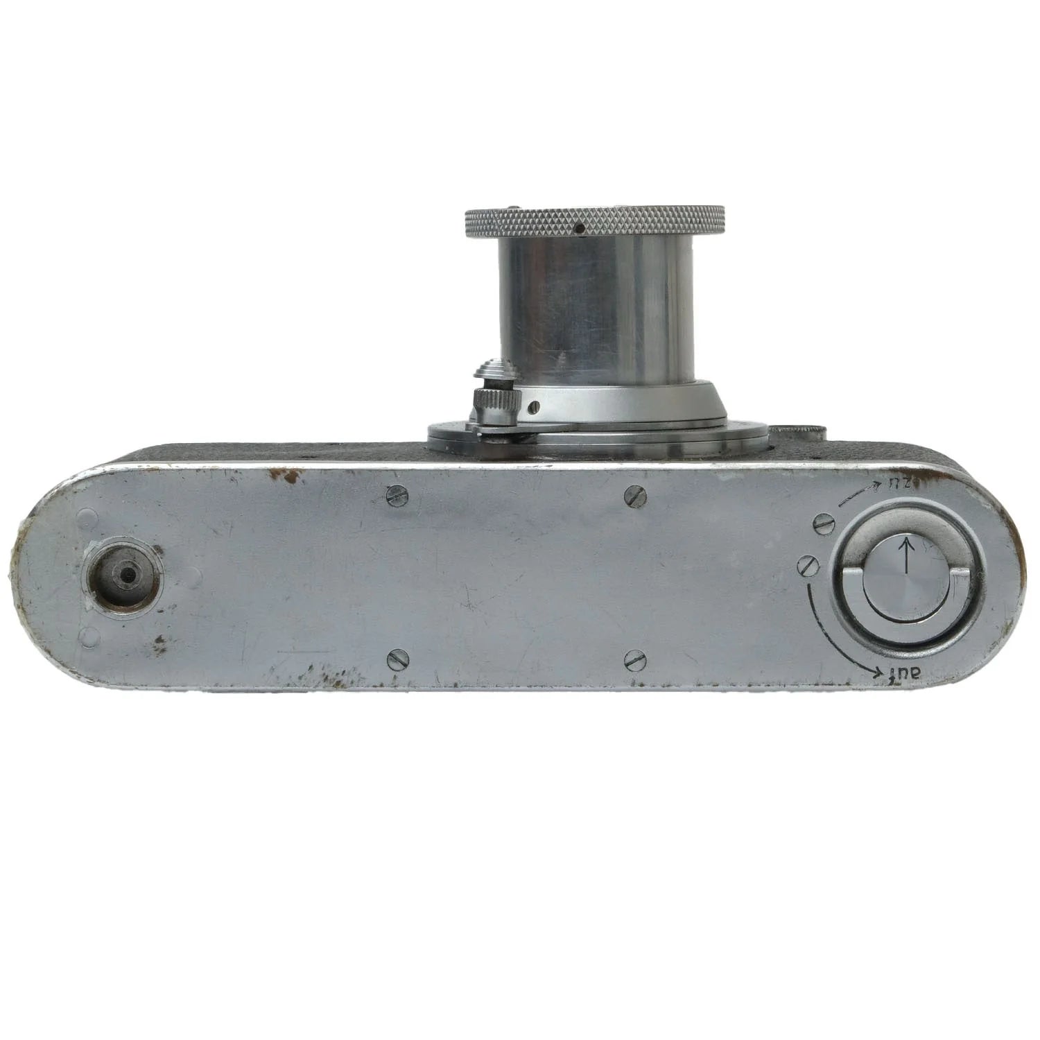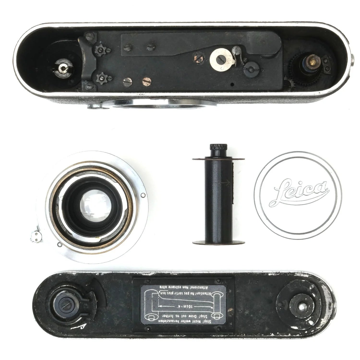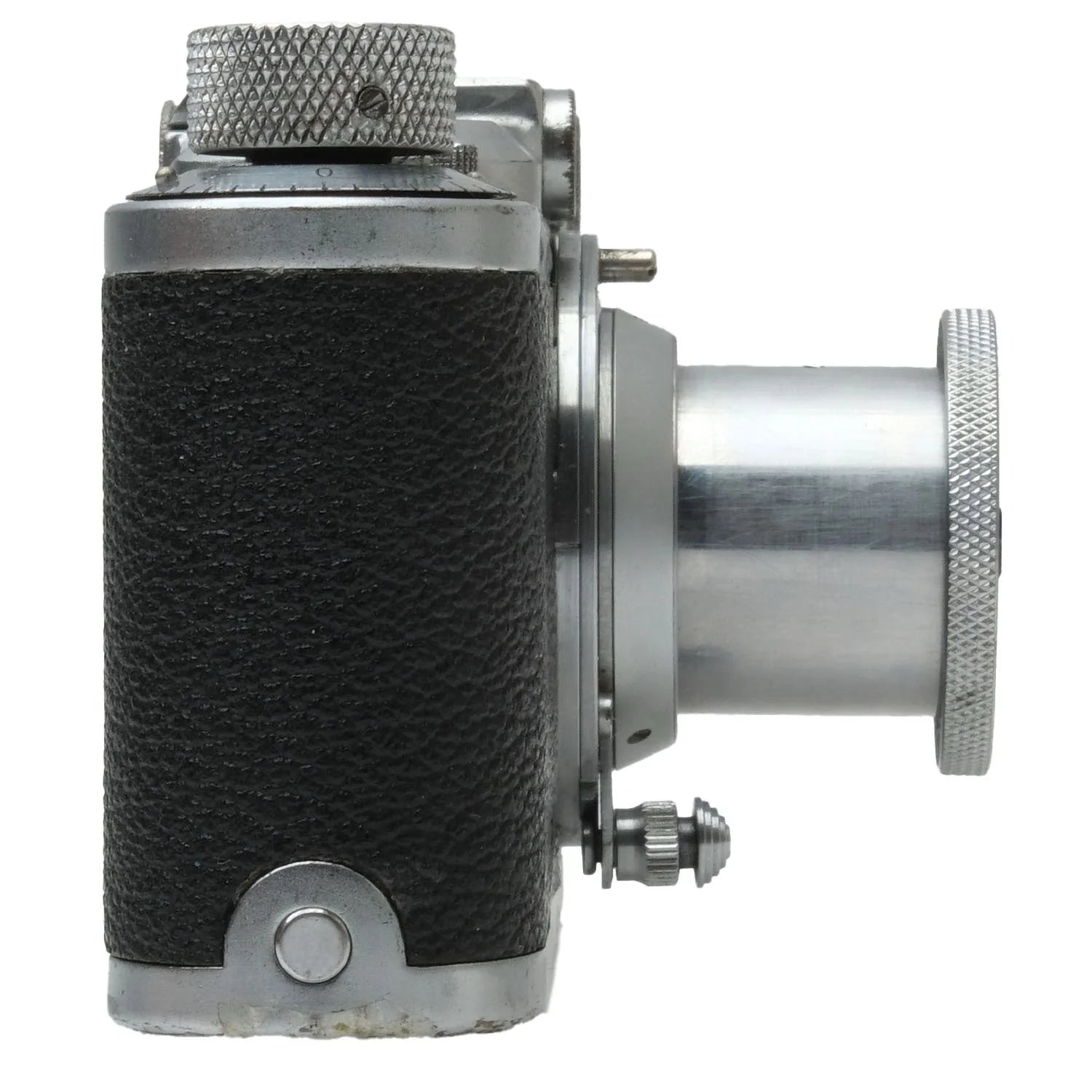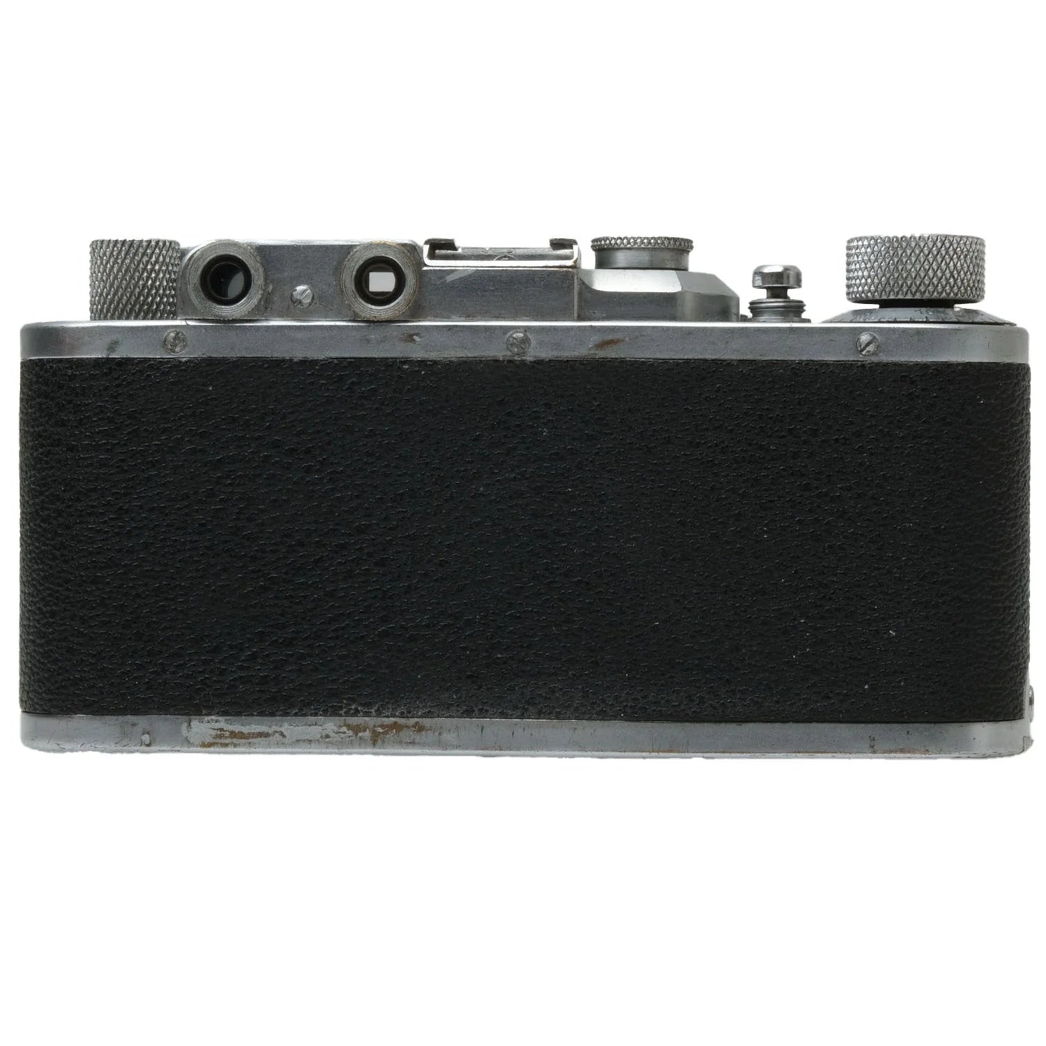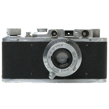 This Leica II (Silver), #182707, is in fair condition with heavy handling wear. I rate it cosmetically a (7+). The camera is in proper working order; film advances properly, the viewfinder is clear, the shutter is accurate at all speeds, and the rangefinder is accurate. The included Leica 5cm f3.5 Elmar lens, #572624, is in similar condition, also rated a (7+). The lens extends and retracts properly and the aperture tab is smooth, but the focus ring is a bit stiff. The aperture functions properly and the glass has no marks, or fungus, but there's haze and dust inside. This listing includes a front lens cap, but no rear lens cap or body cap.