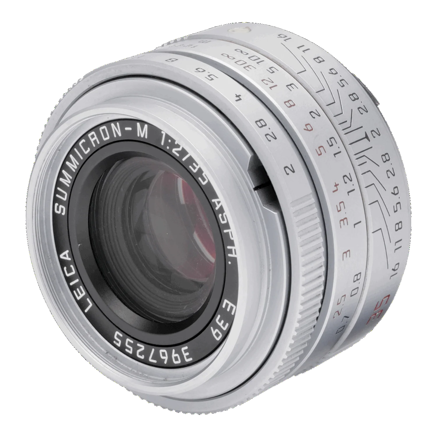 This Leica 35mm f2 Summicron-M Asph Silver, 3967255, is in excellent condition. I rate it at (9). The focus is smooth, and the aperture works. It is clean, has no haze, marks, or fungus, but does have faint internal dust, which will not affect the image. It comes with a lens shade and correct front and rear caps.