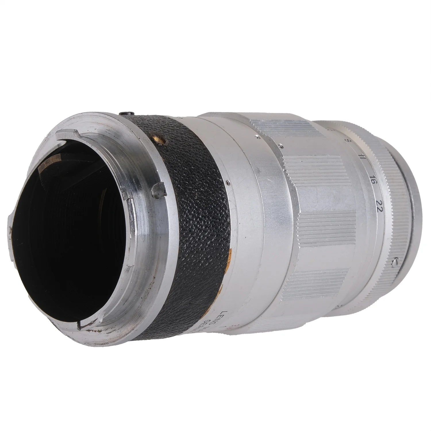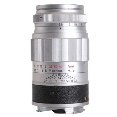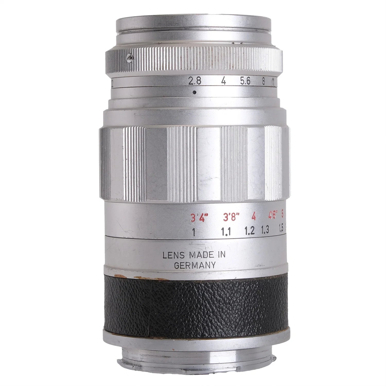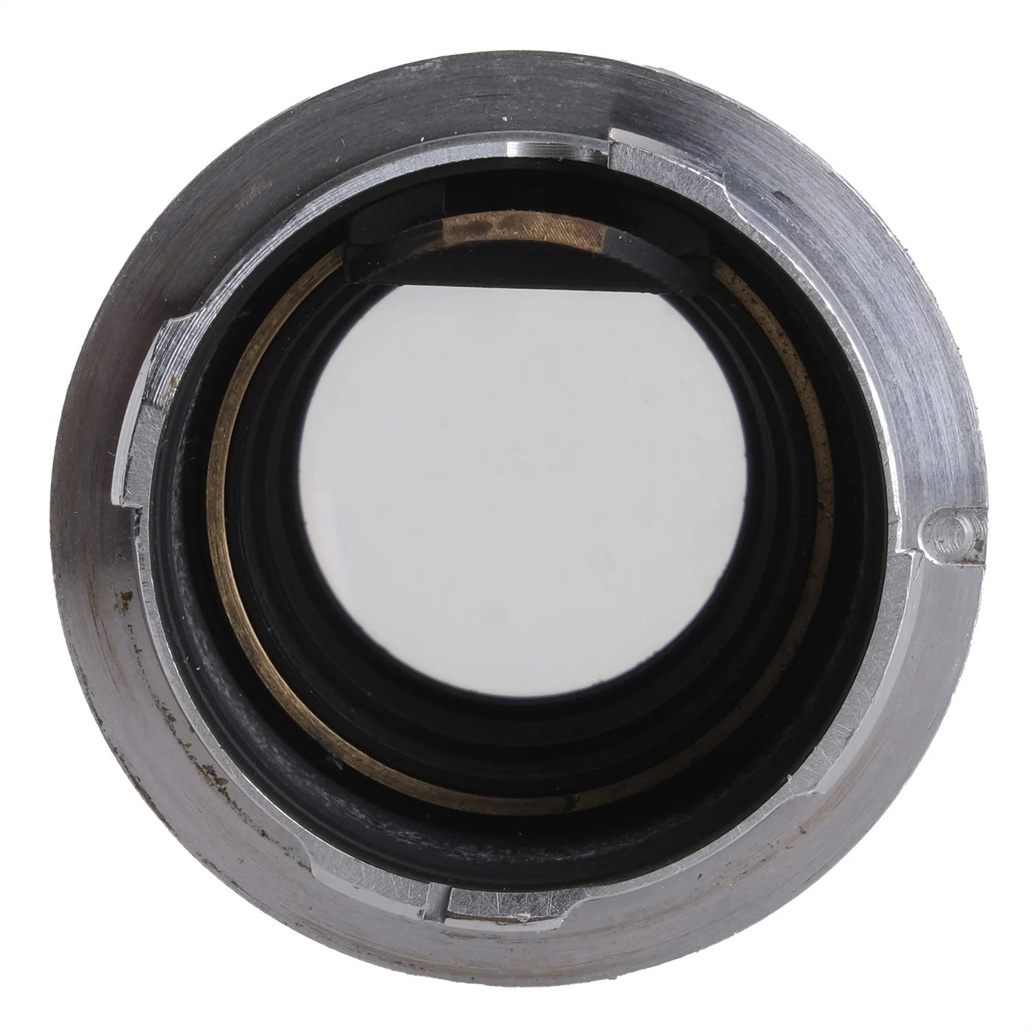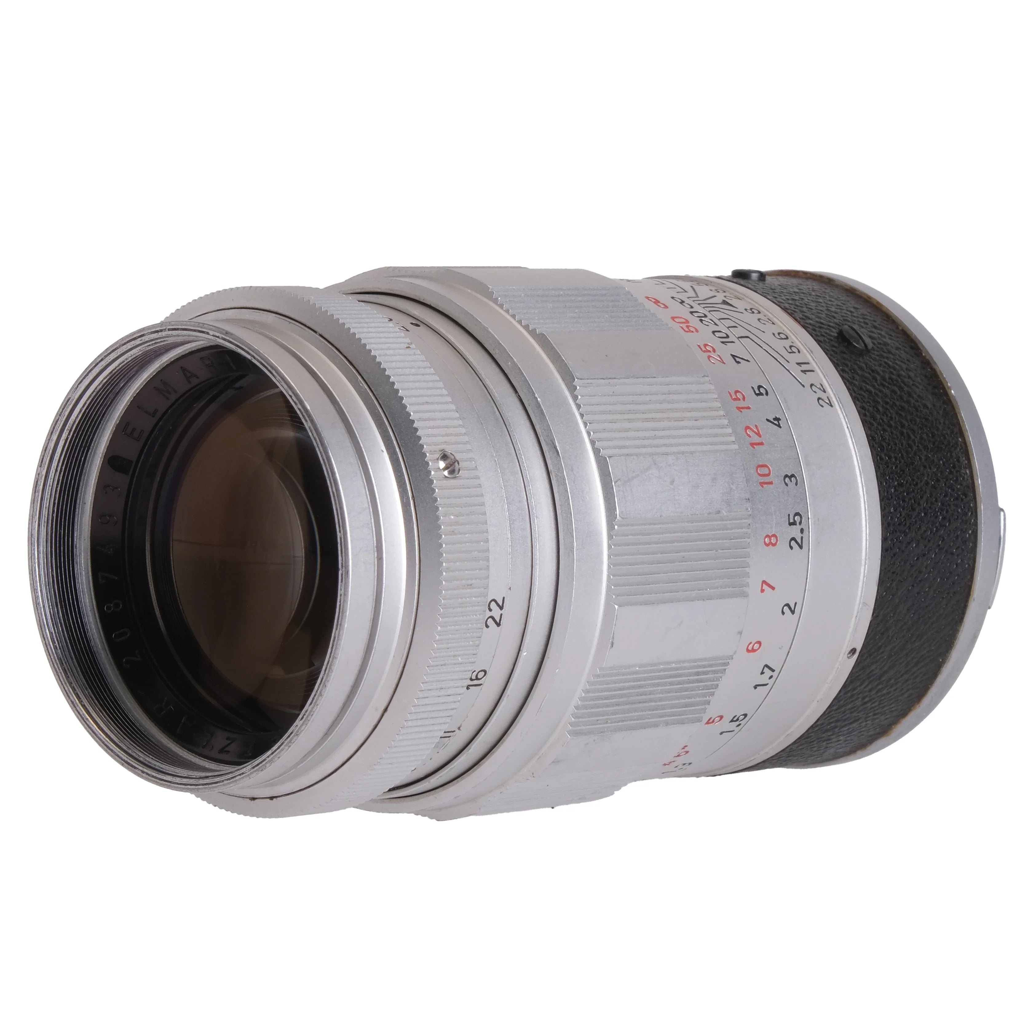 This Leica 90mm f2.8 Elmarit Lens #2087493, is in bargain cosmetic condition with significant signs of heavy handling wear found throughout, please see photos for visual reference. Cosmetically, this lens has been rated at a (7+). This lens is in working order; the aperture and focus turn smoothly, and the glass has minor residue around the front element and faint edge haze which should not affect image quality. There are no signs of fungus present. This lens comes with a lens shade, lens shade cap, and a rear cap. This lens will make a great addition to your vintage Leica collection!