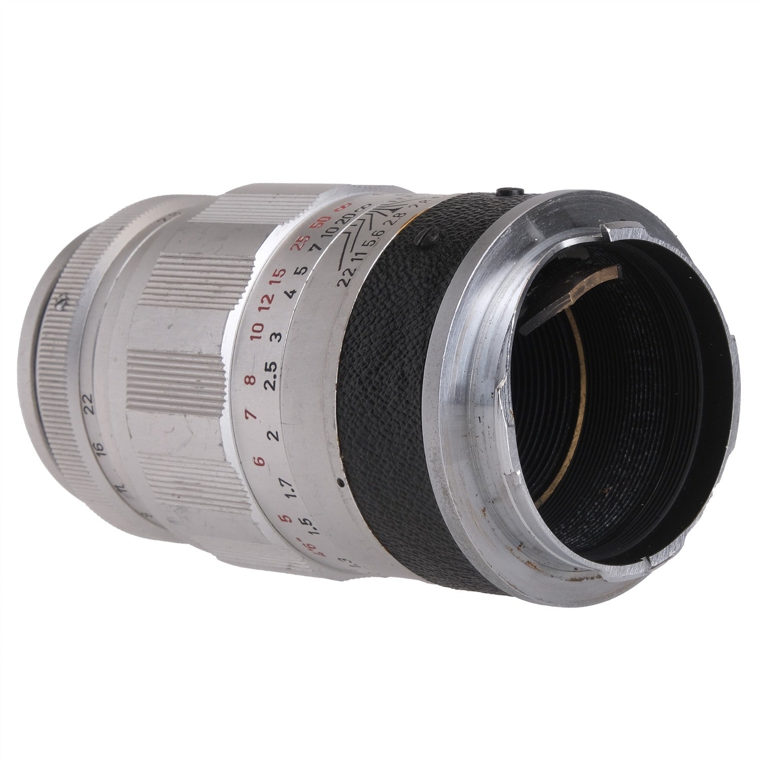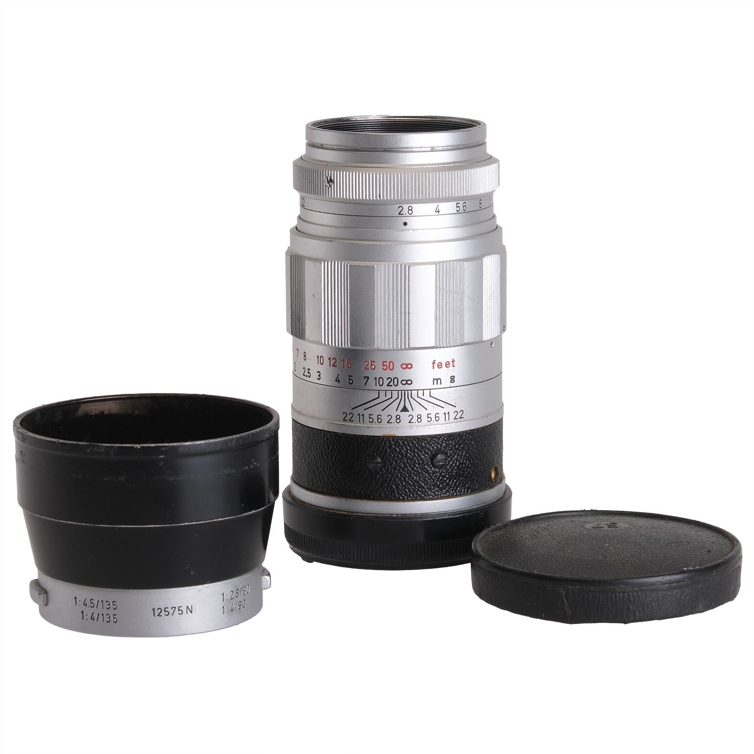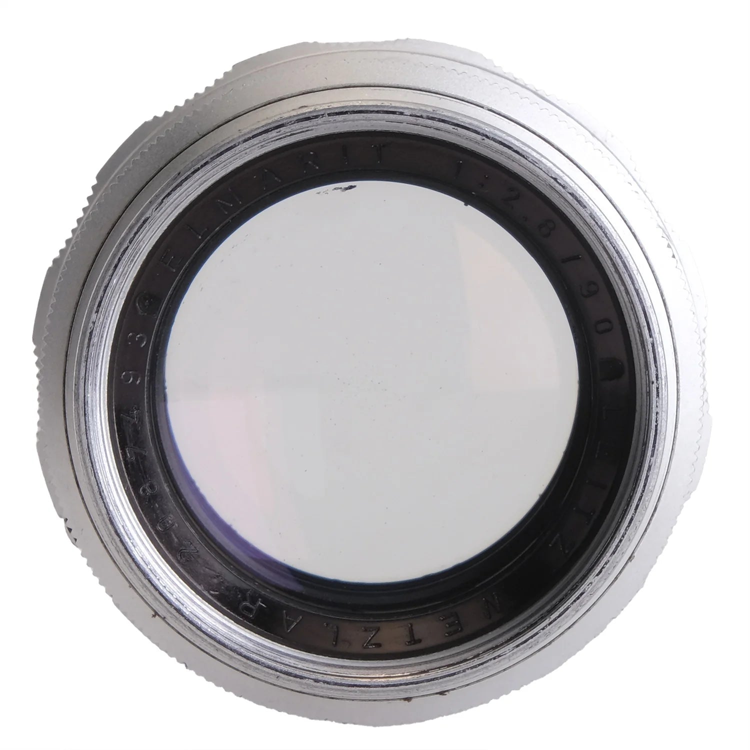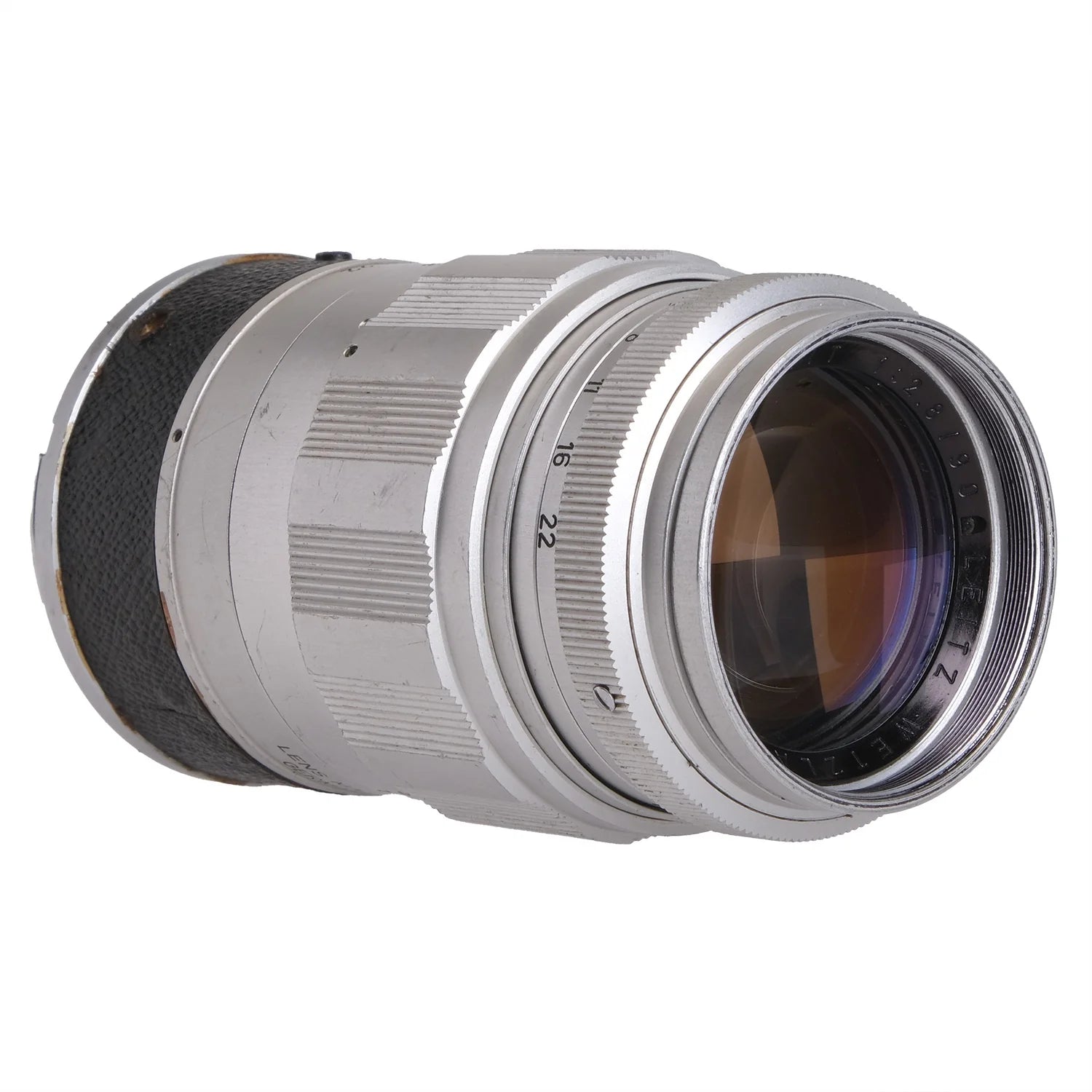 This Leica 90mm f2.8 Elmarit Lens #2087493, is in bargain cosmetic condition with significant signs of heavy handling wear found throughout, please see photos for visual reference. Cosmetically, this lens has been rated at a (7+). This lens is in working order; the aperture and focus turn smoothly, and the glass has minor residue around the front element and faint edge haze which should not affect image quality. There are no signs of fungus present. This lens comes with a lens shade, lens shade cap, and a rear cap. This lens will make a great addition to your vintage Leica collection!