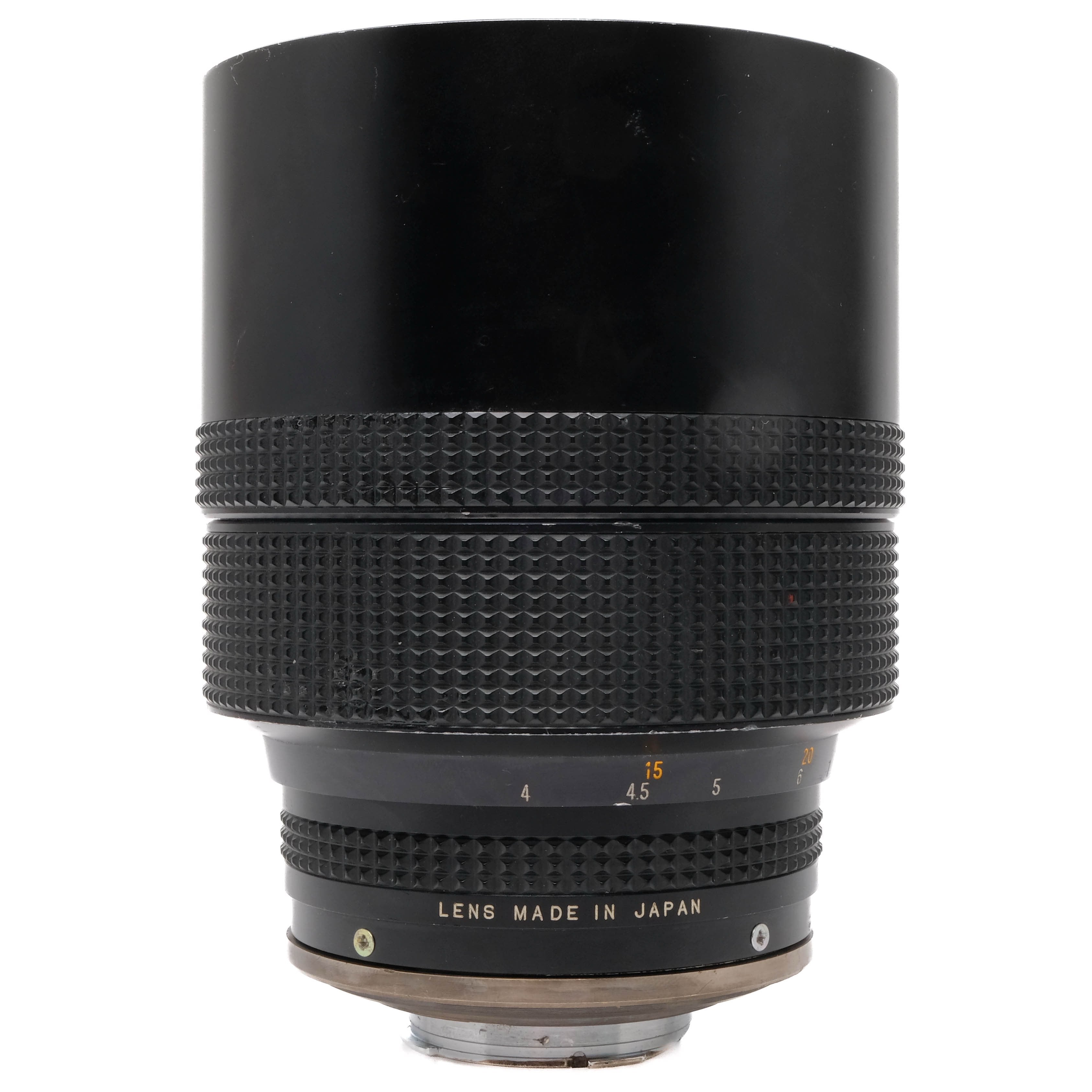 This Mamiya 500mm f8 Reflex C is in good condition with only minor handling and edge wear. I rate this cosmetically (8+). This lens is in proper working order and the focus is smooth. The glass has no fungus or haze but there is internal dust and scratches on the rear element. This lens comes with a rear cap.
