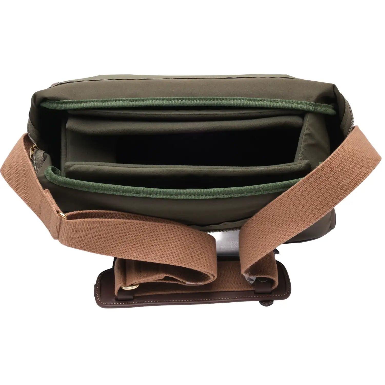 This Billingham Eventer Mk II Camera & Laptop Bag (Sage Fibernyte/Chocolate Leather), #0000543196, is in good condition with some handling wear. I rate it cosmetically an (8+). All of the clasps and zippers open & shut and the interior is in good condition. It include two olive dividers, two olive divider flaps, and a chocolate SP-50 shoulder pad. Please refer to the photos for details.