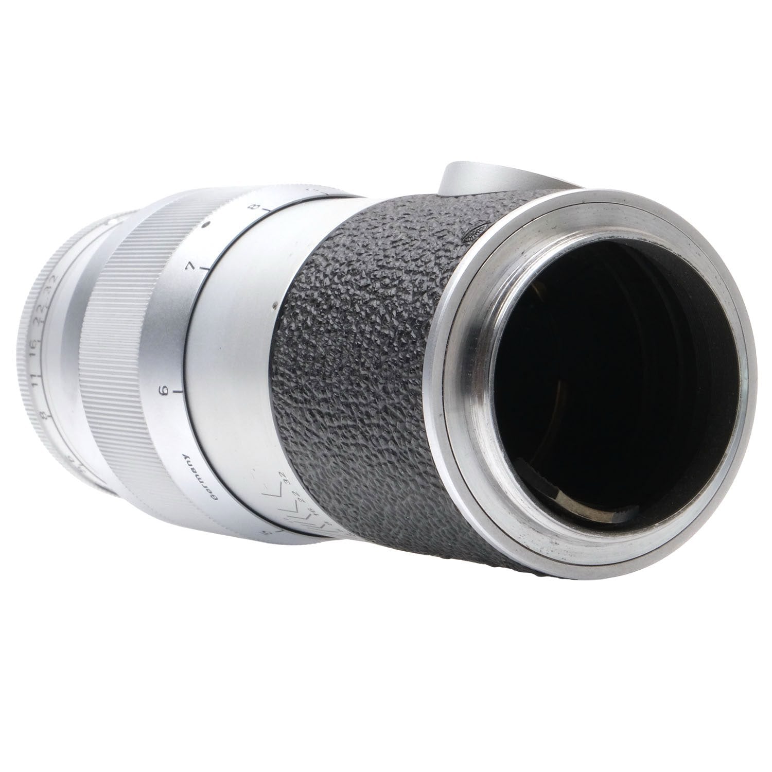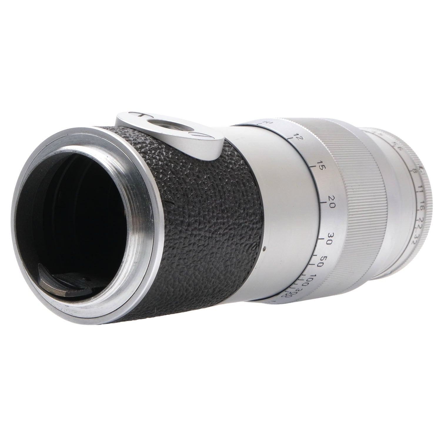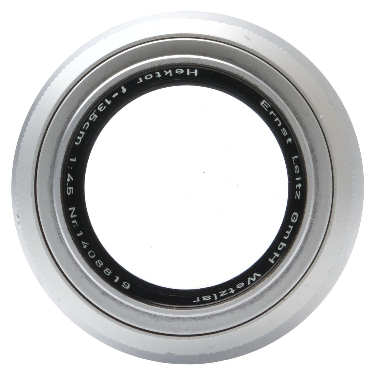 This Leica 13.5cm f4.5 Hektor Lens (Silver), #1408819, is in great condition with minor handling wear. I rate it cosmetically a (9). The aperture ring is smooth and the aperture functions properly. The glass is clean and clear with no haze, marks, or fungus. There are a few faint specks of dust inside, but they do not affect image quality. The focusing helicoid is quite stiff. This lens is for Leica screw mount/thread mount (LTM) and other E39 bodies. It includes front & rear caps.