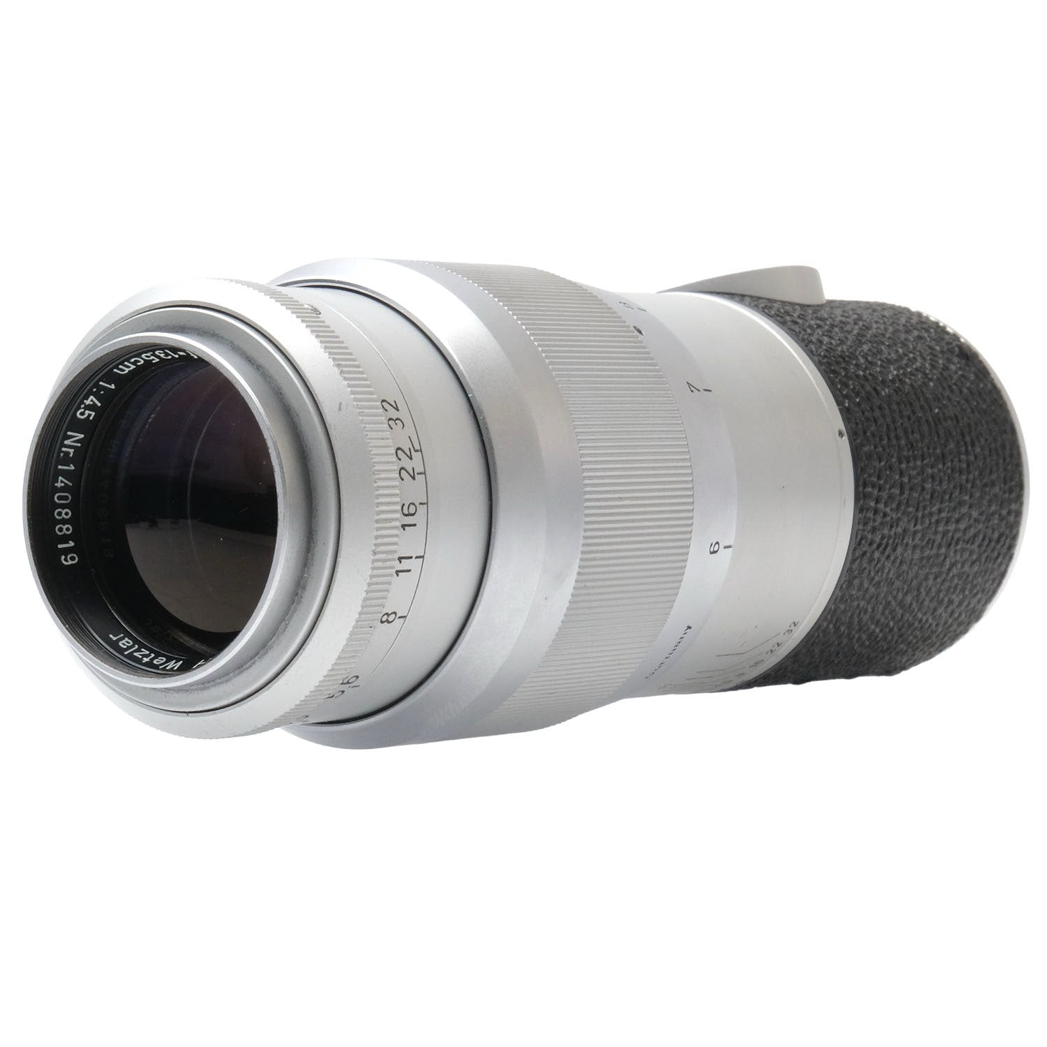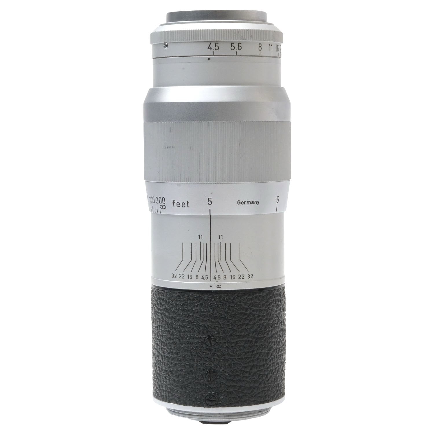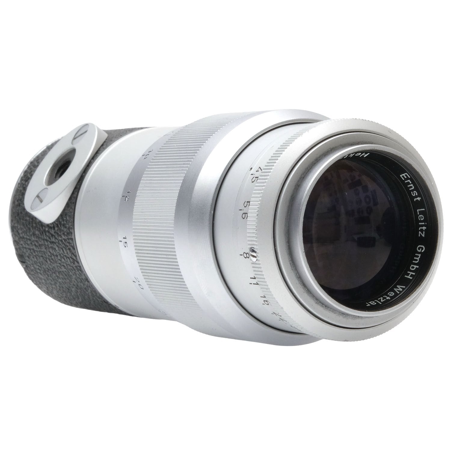 This Leica 13.5cm f4.5 Hektor Lens (Silver), #1408819, is in great condition with minor handling wear. I rate it cosmetically a (9). The aperture ring is smooth and the aperture functions properly. The glass is clean and clear with no haze, marks, or fungus. There are a few faint specks of dust inside, but they do not affect image quality. The focusing helicoid is quite stiff. This lens is for Leica screw mount/thread mount (LTM) and other E39 bodies. It includes front & rear caps.
